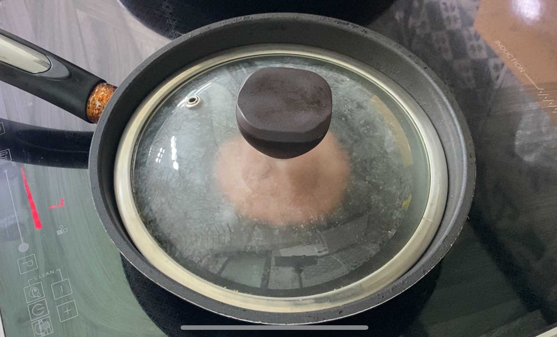 프라이팬이 달궈지면 기름을 살짝 두른 후 패티를 굽는데요, 구울 때 프라이팬 뚜껑을 닫은 상태로 굽는 것이 좋습니다. 프라이팬 뚜껑 없이 센 불에 패티를 굽다 보면 겉에만 타고 정작 패티 속은 충분히 익지 않을 수 있습니다.