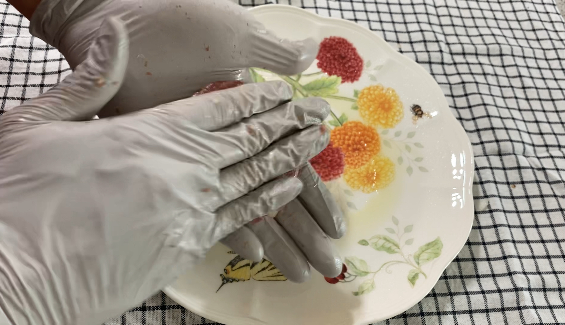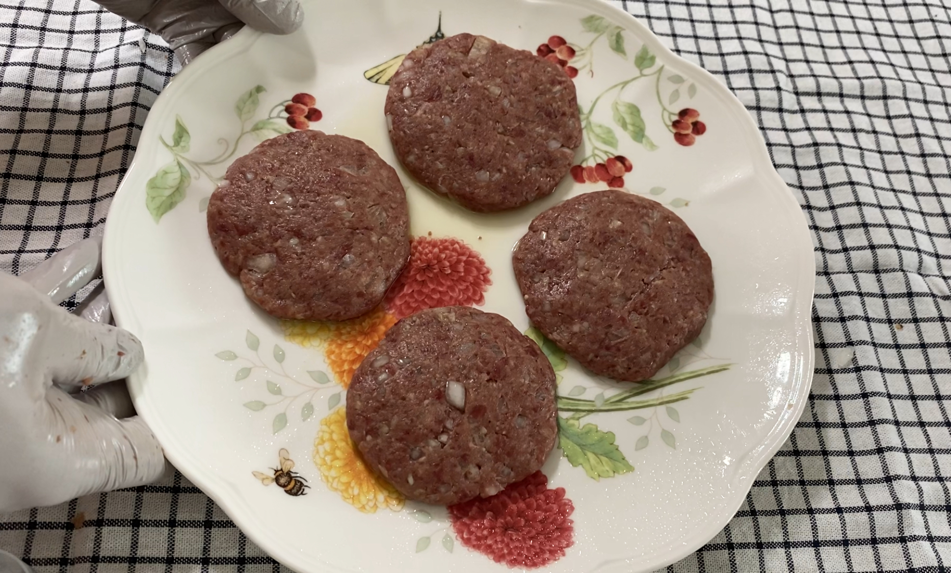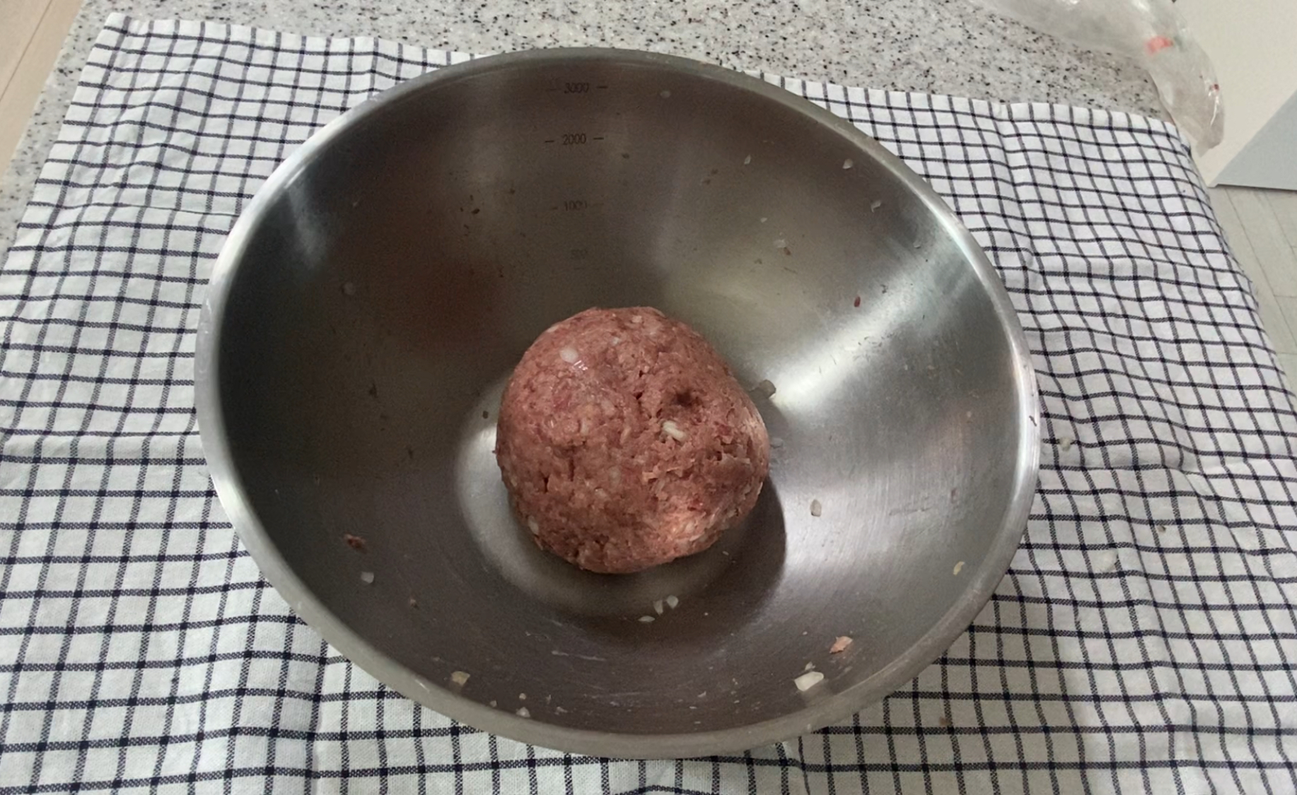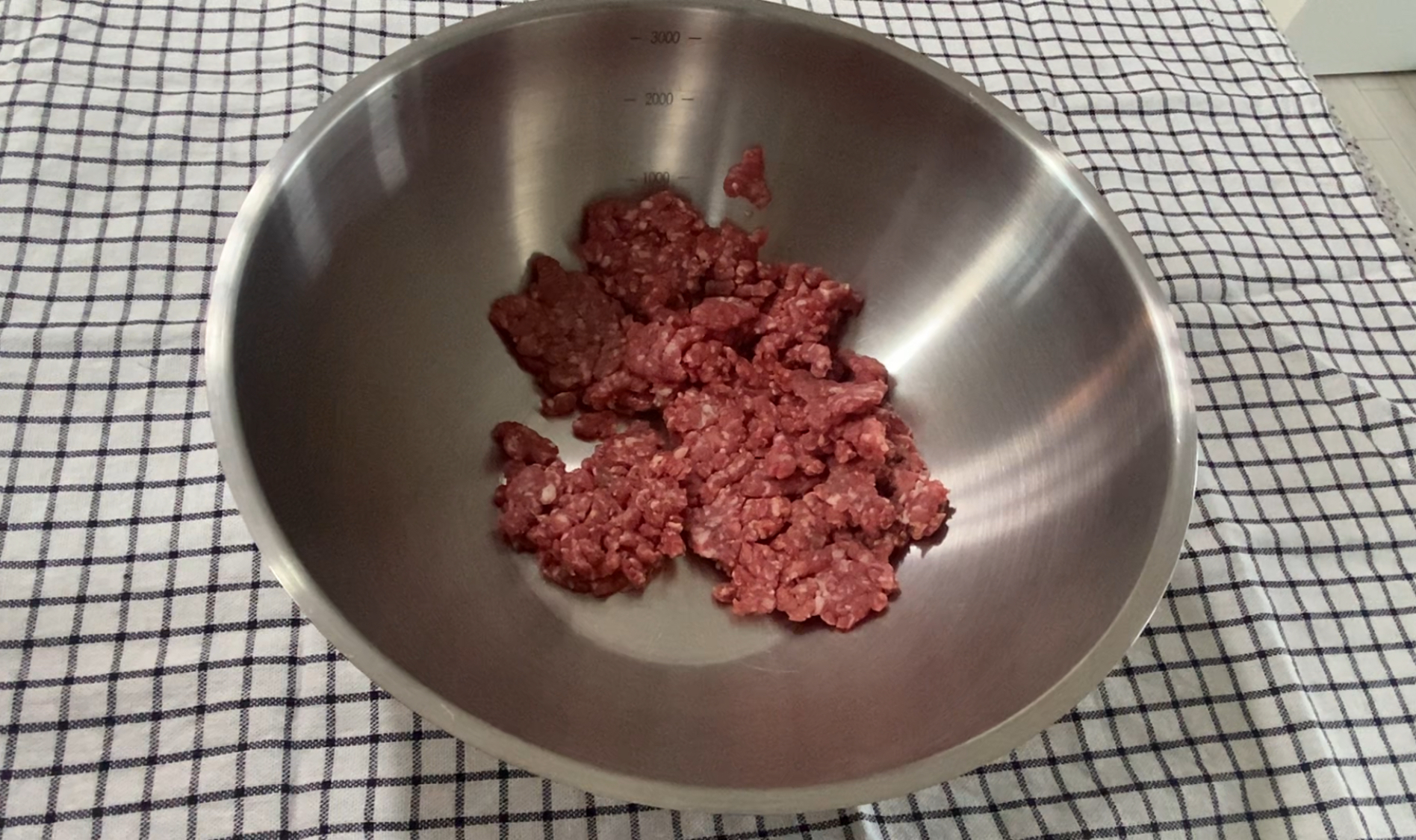 햄버거 패티 재료로 다진 소고기를 사용하는 데 핏물이 있는 채로 사용하면 비린내가 날 수 있습니다. 따라서, 먼저 키친타월로 다진 소고기를 꾹 눌러 핏물을 빼주는 작업을 합니다.