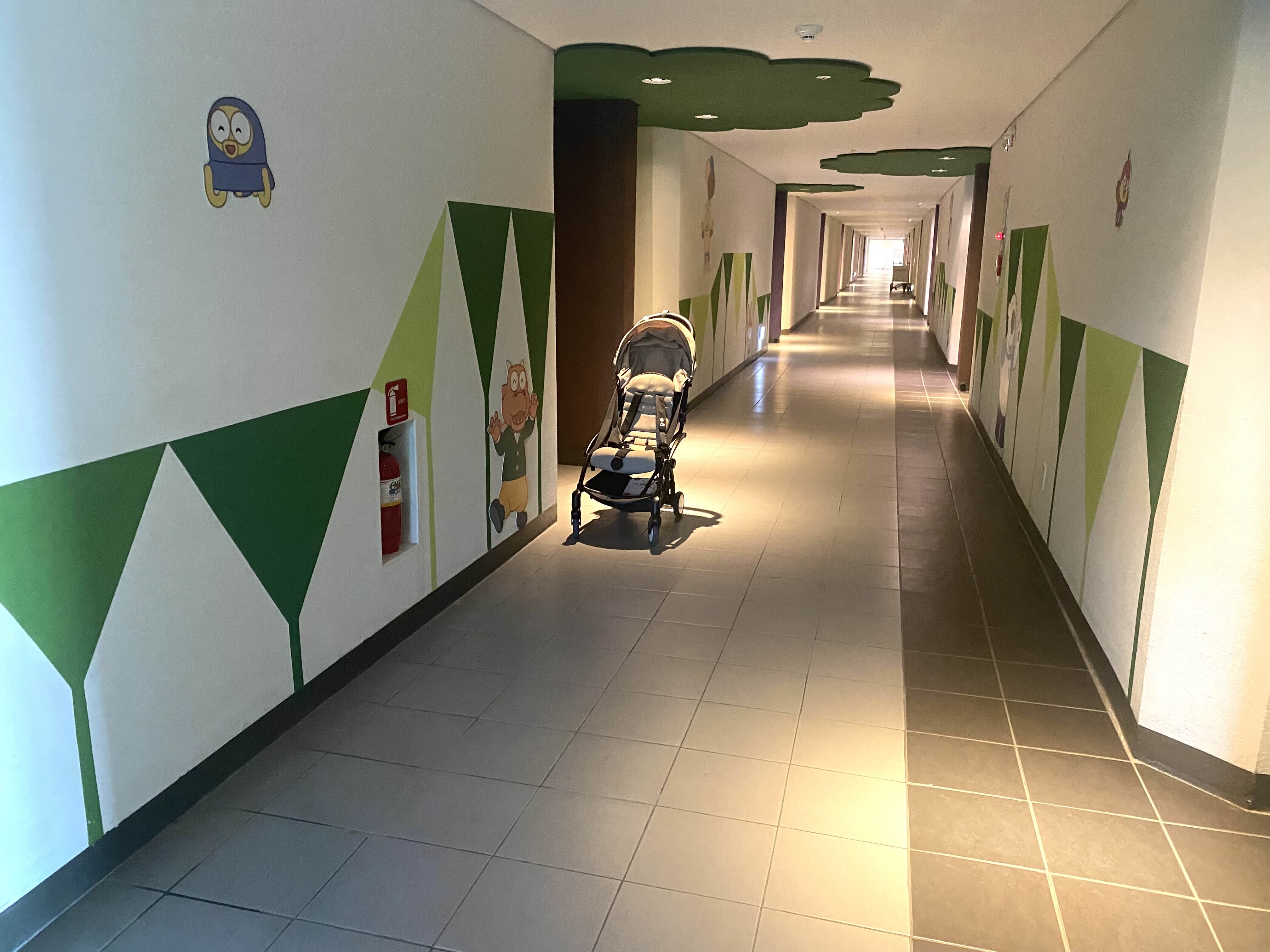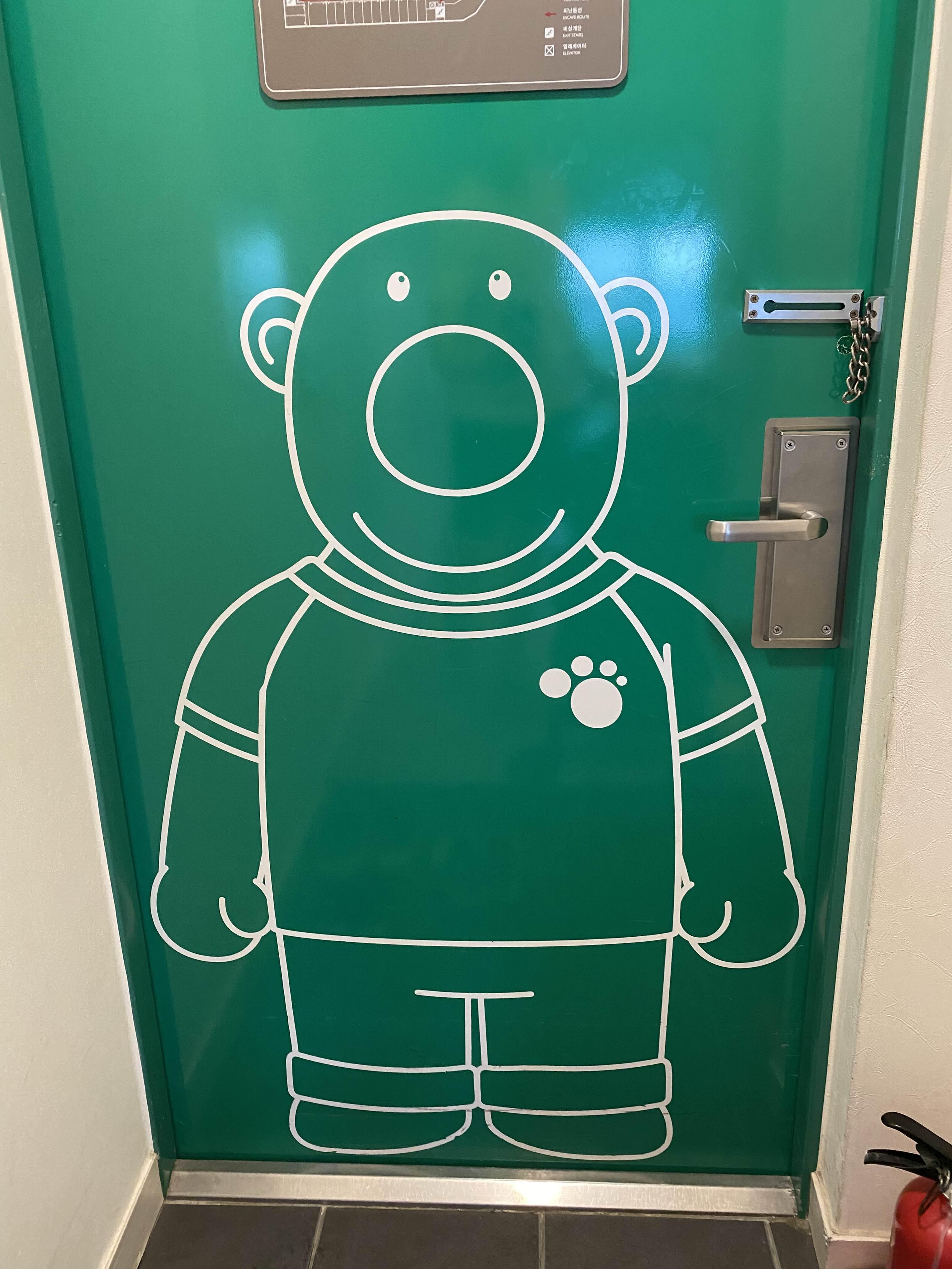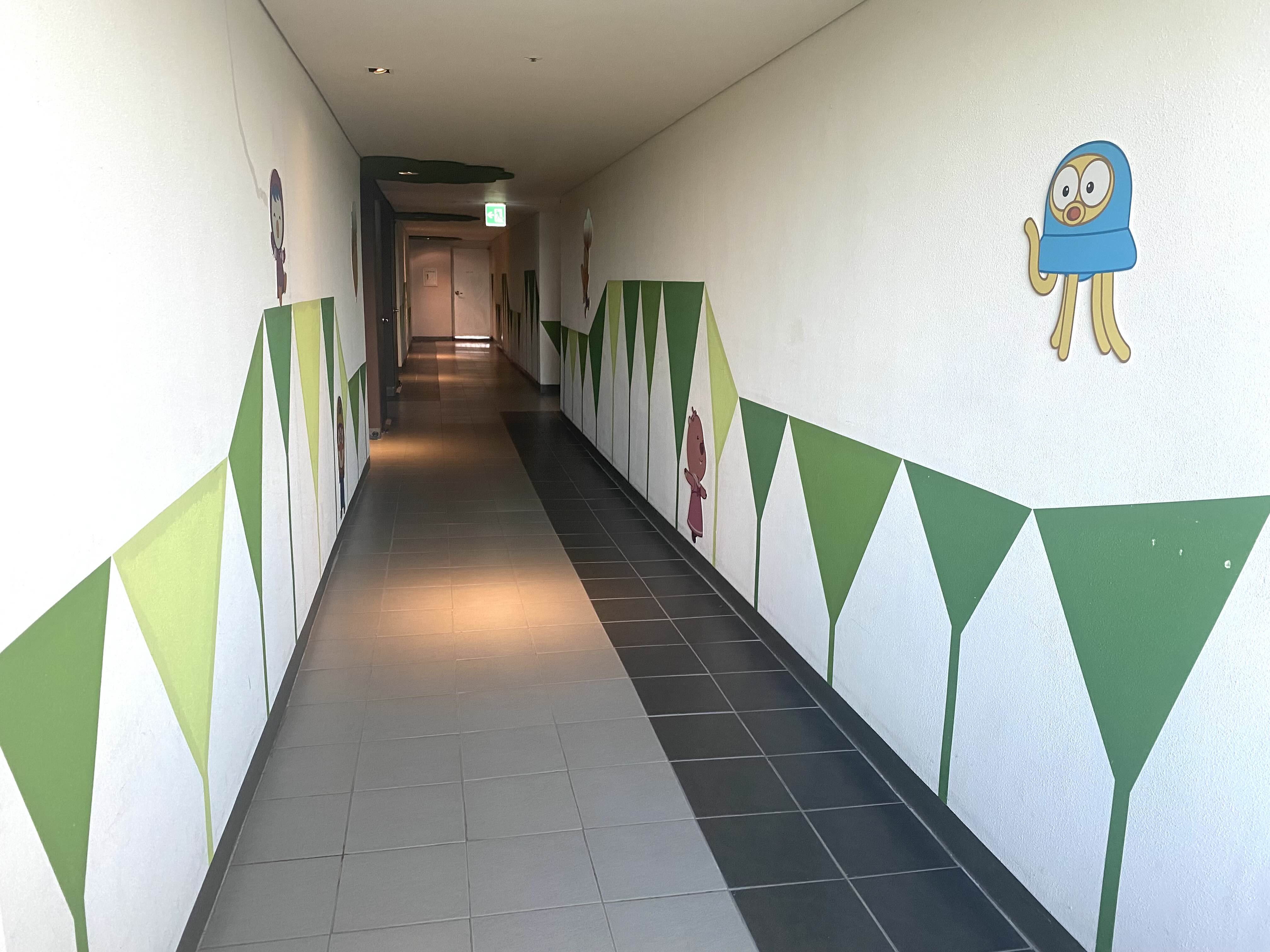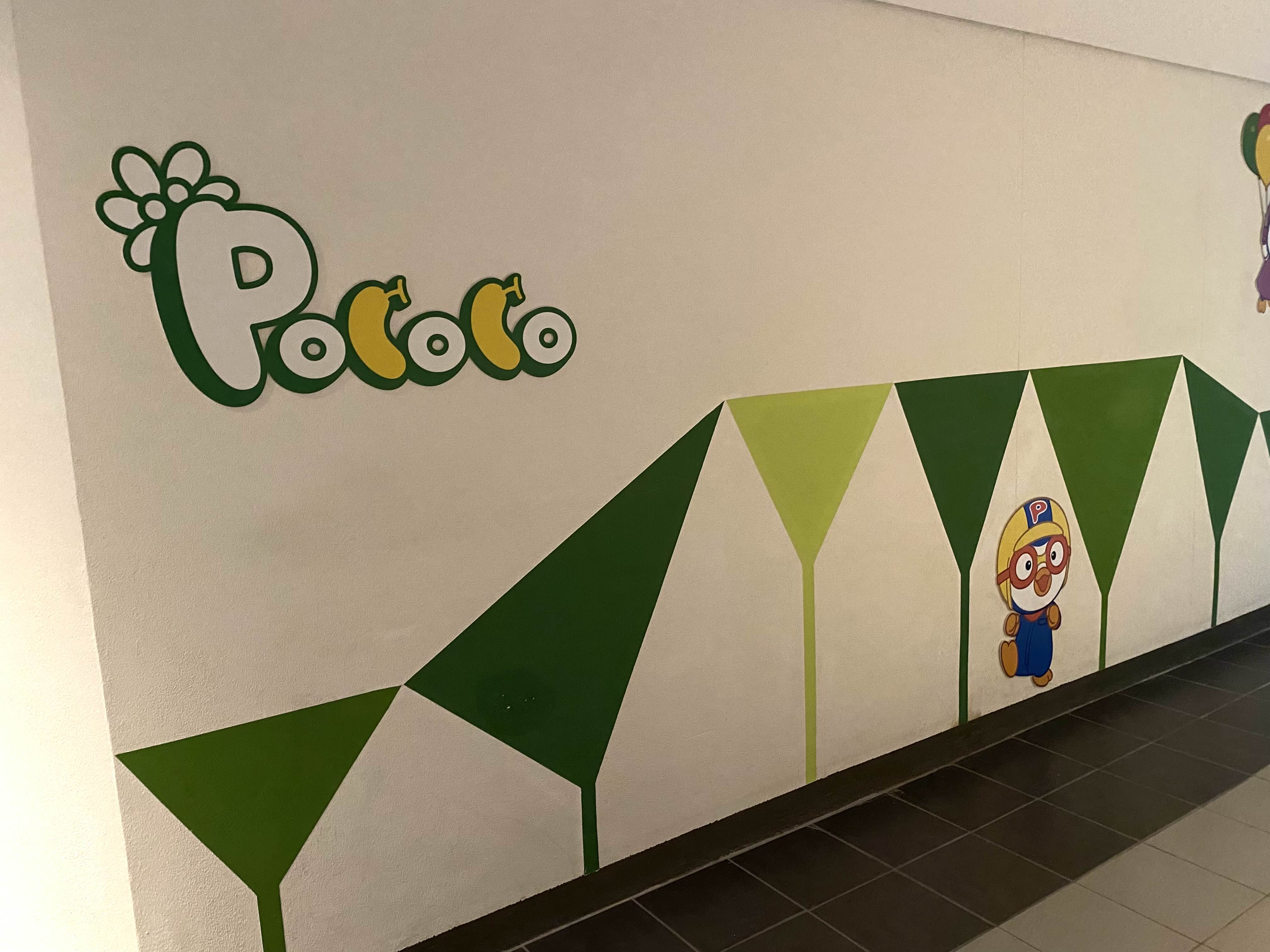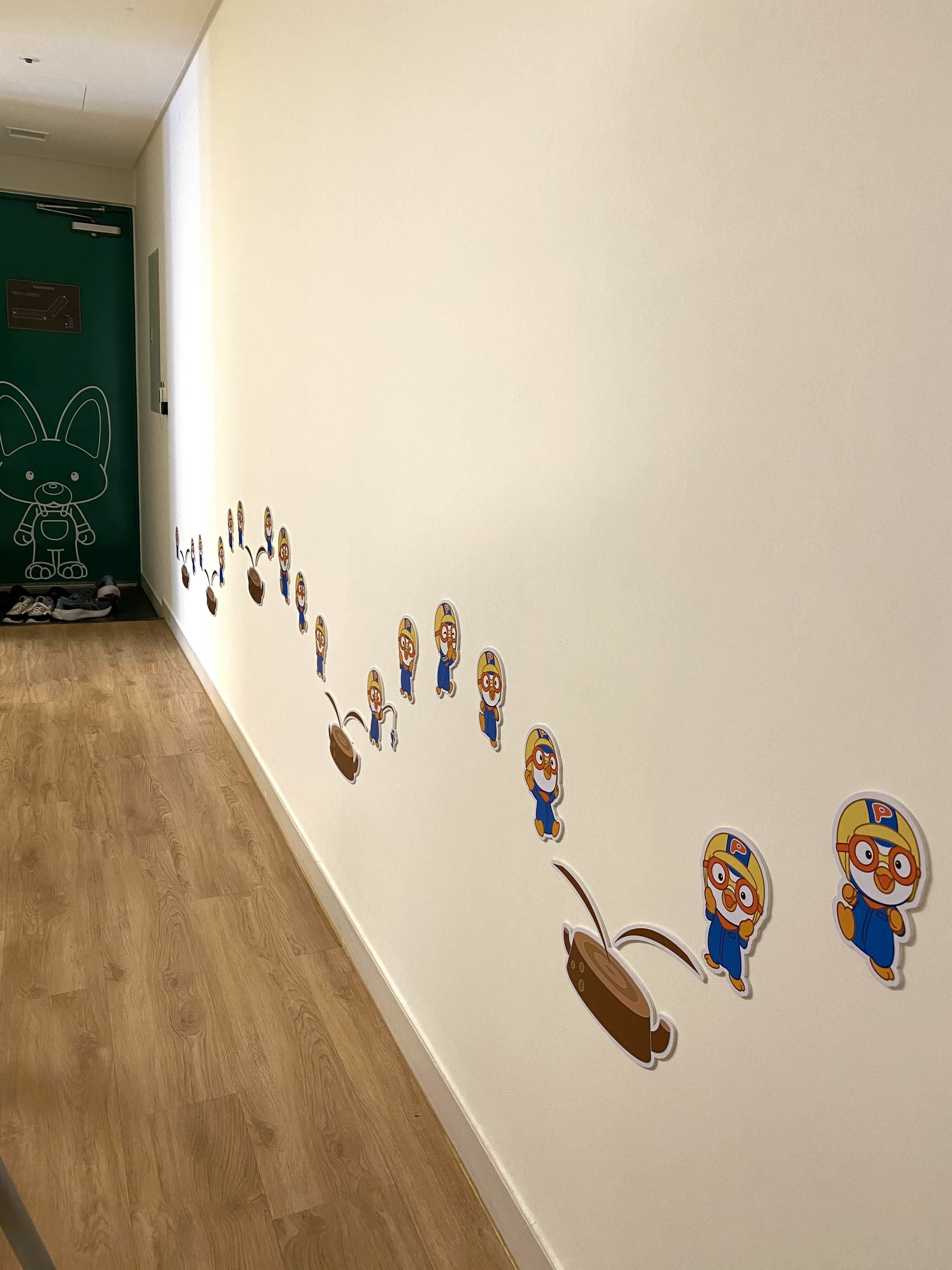뽀로로 객실은 리조트 5층에 있는데 5층 복도 중간 지점에 들어서면 뽀로로 캐릭터가 그려져 있어 이곳이 뽀로로 객실임을 알 수 있습니다.