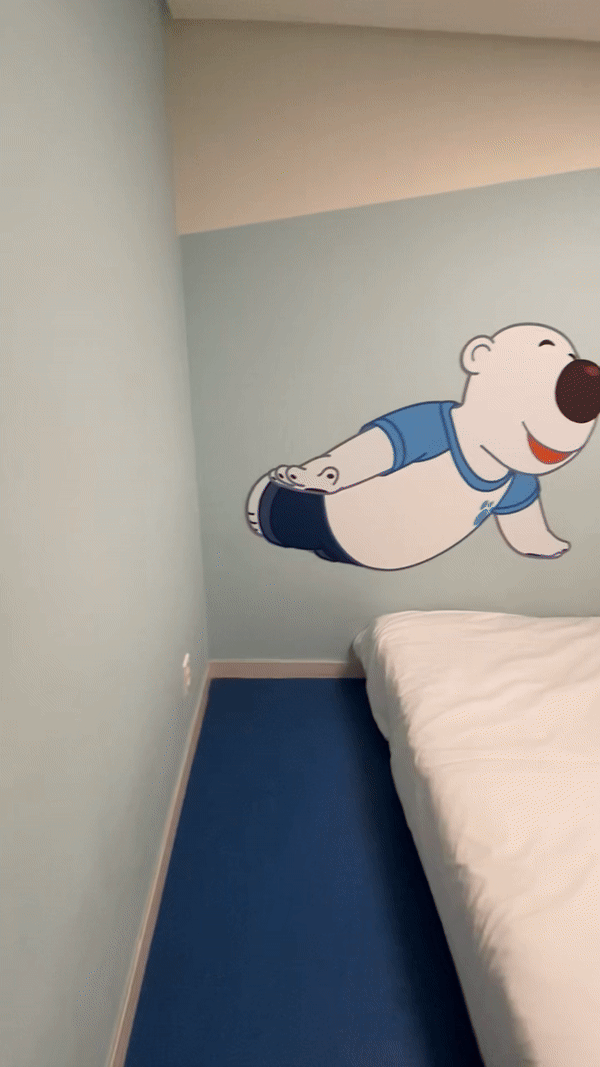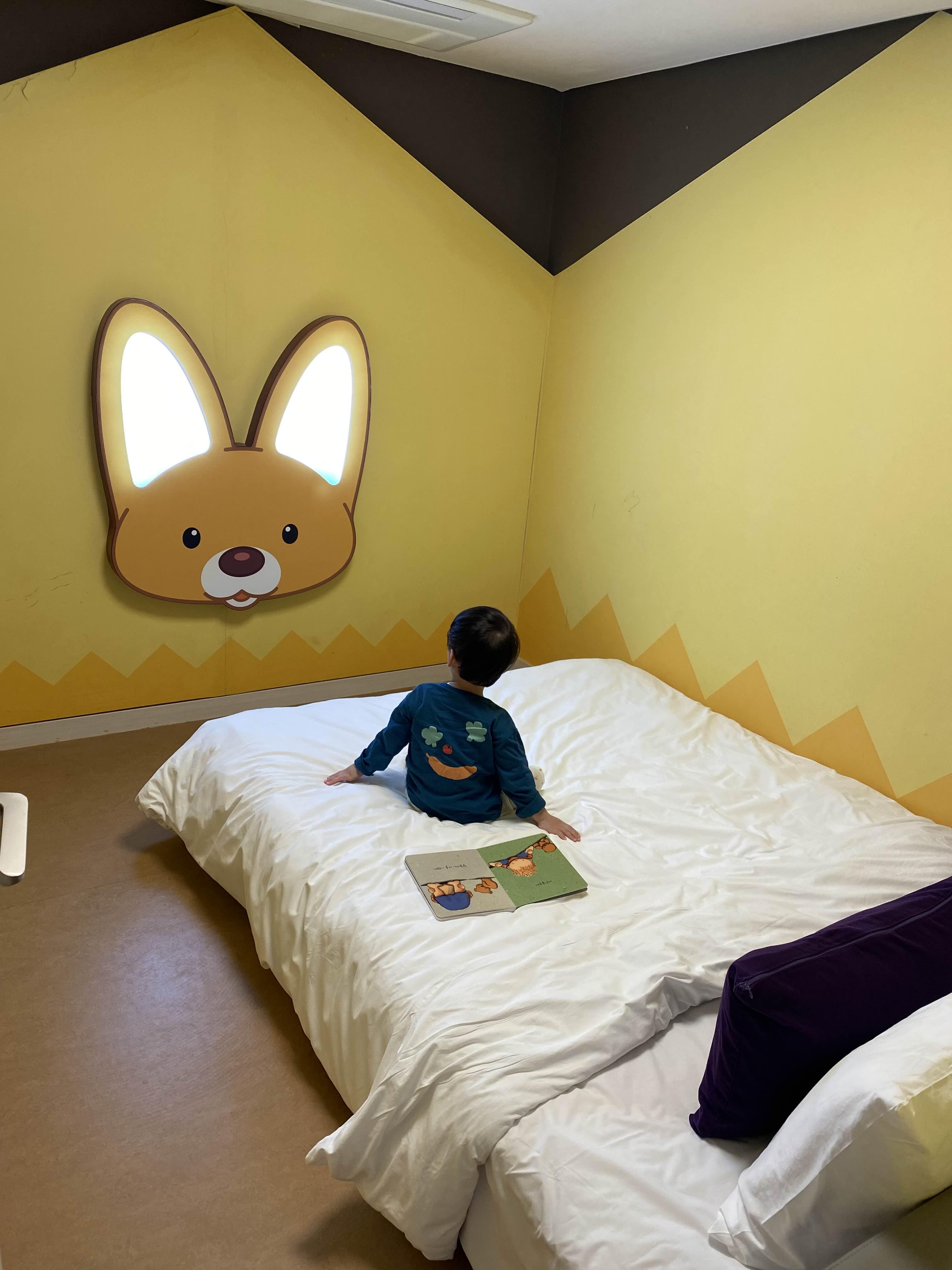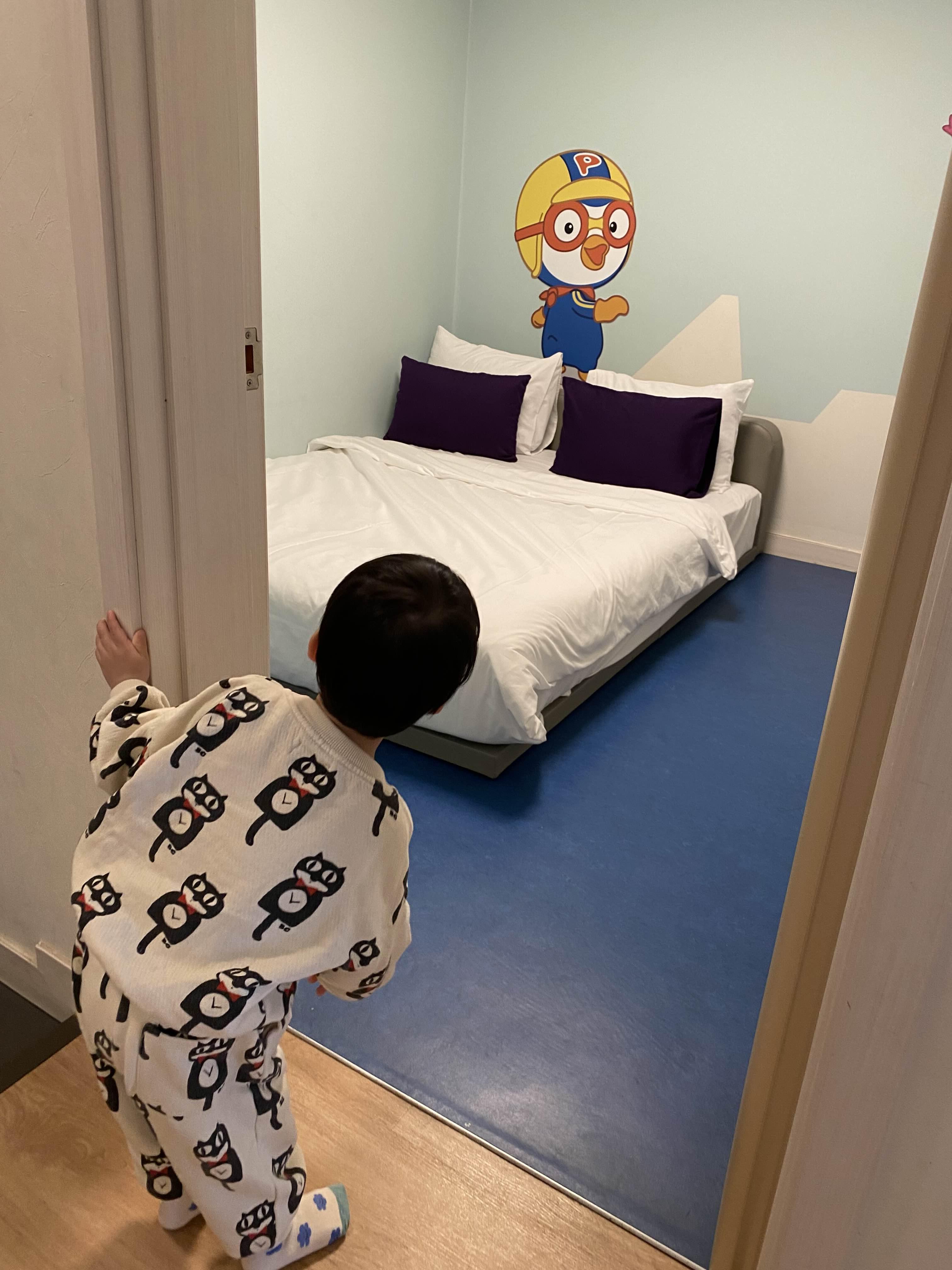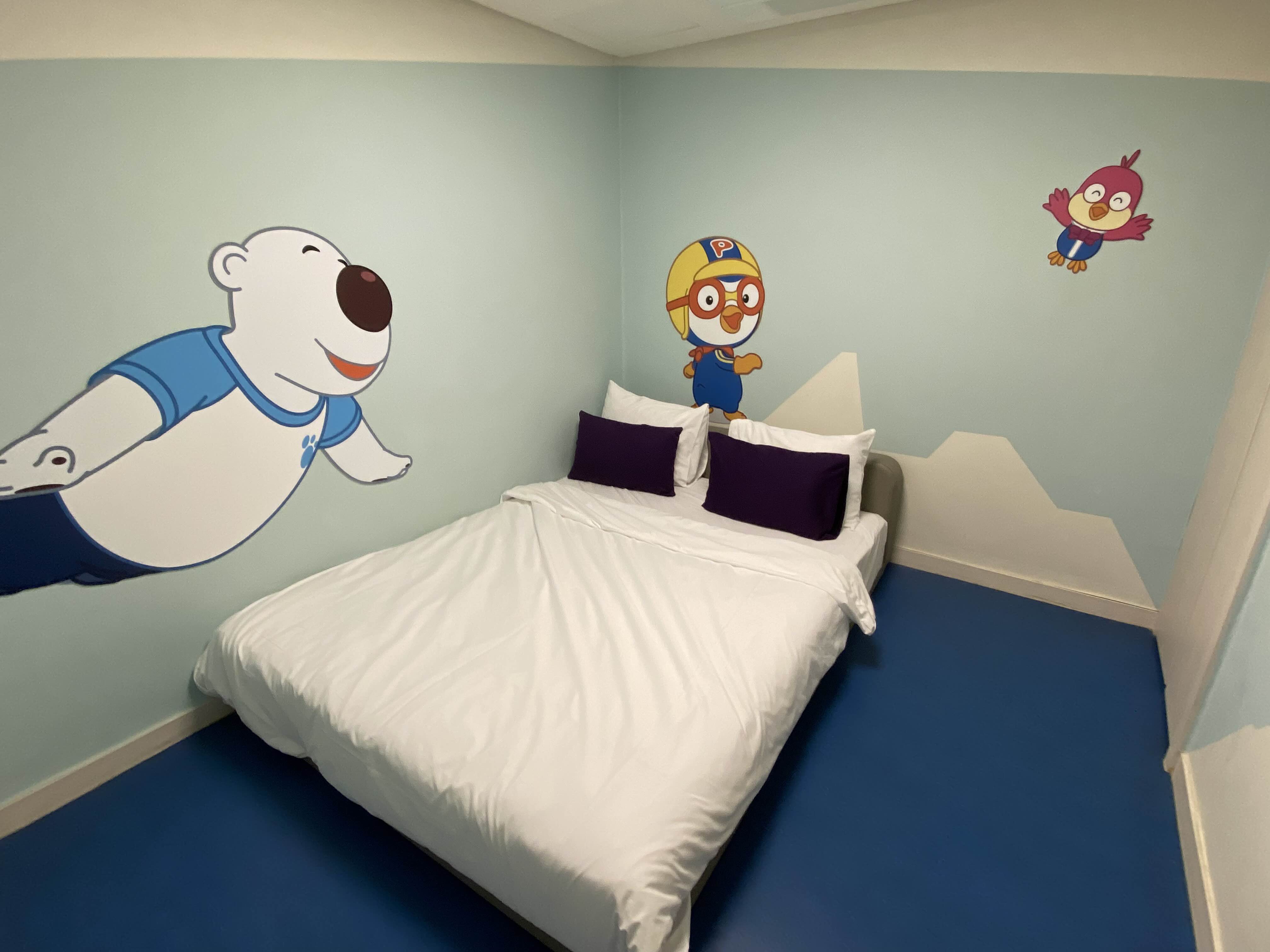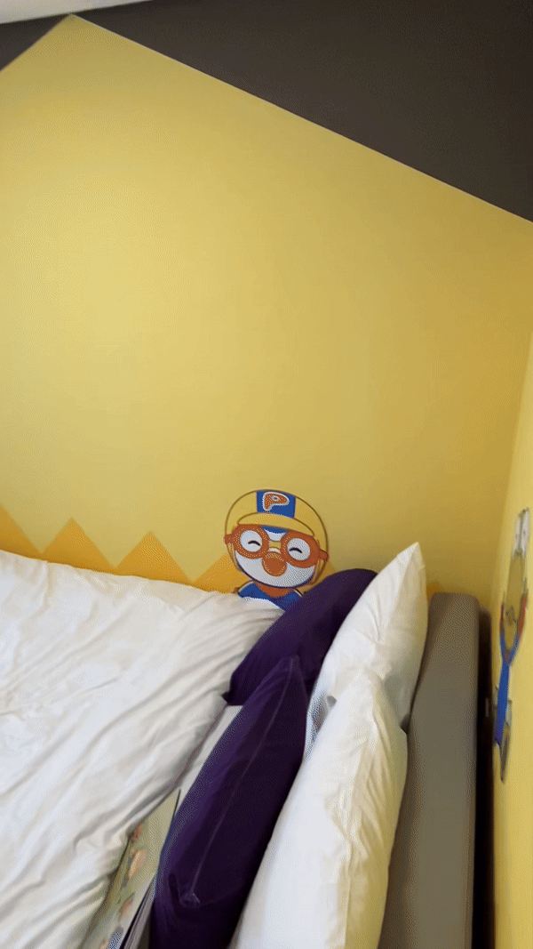 뽀로로 READ 객실의 침실도 뽀로로 캐릭터들로 꾸며져 있는데, 특히 침실 한쪽 면에 설치된 에디의 귀에 불이 들어와 신기하고 재미있었습니다. 덕분에 아이가 침실에서도 뽀로로 캐릭터들을 즐기면서 한참을 뛰어놀았습니다.