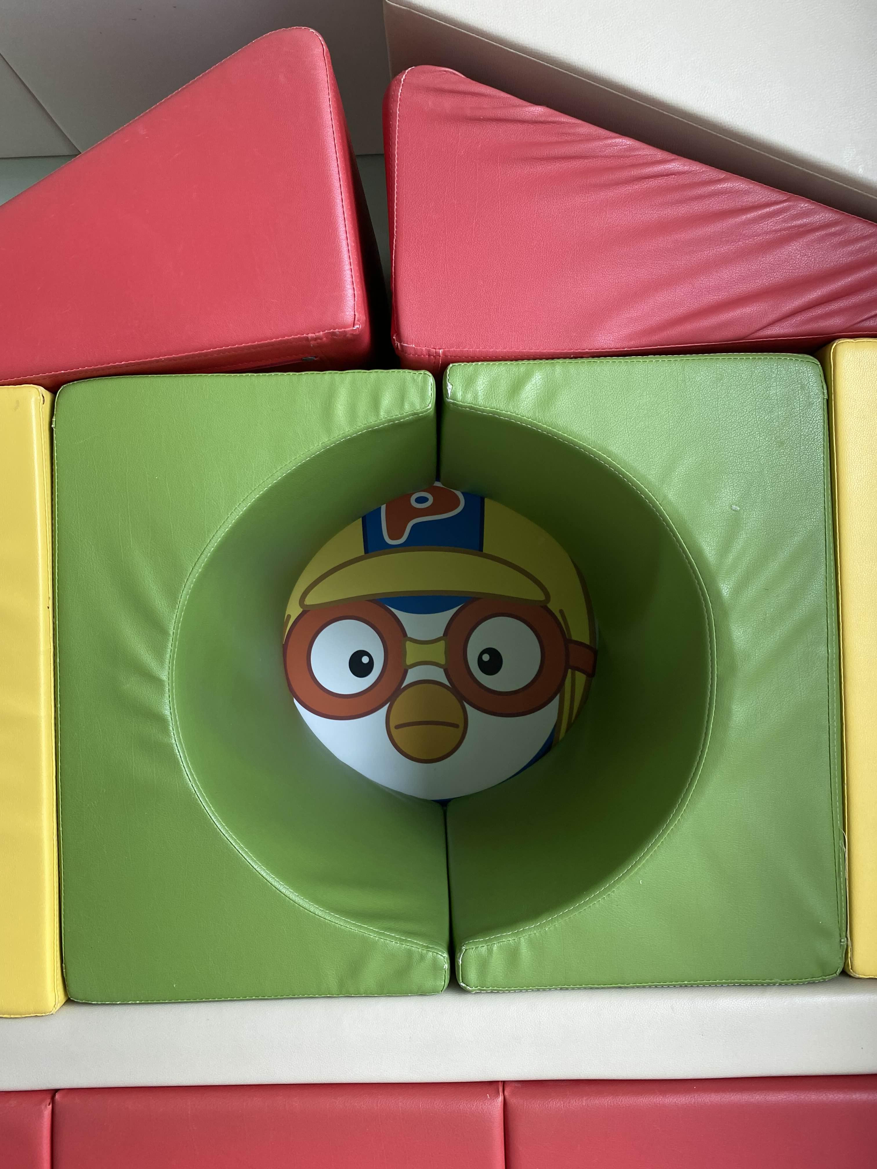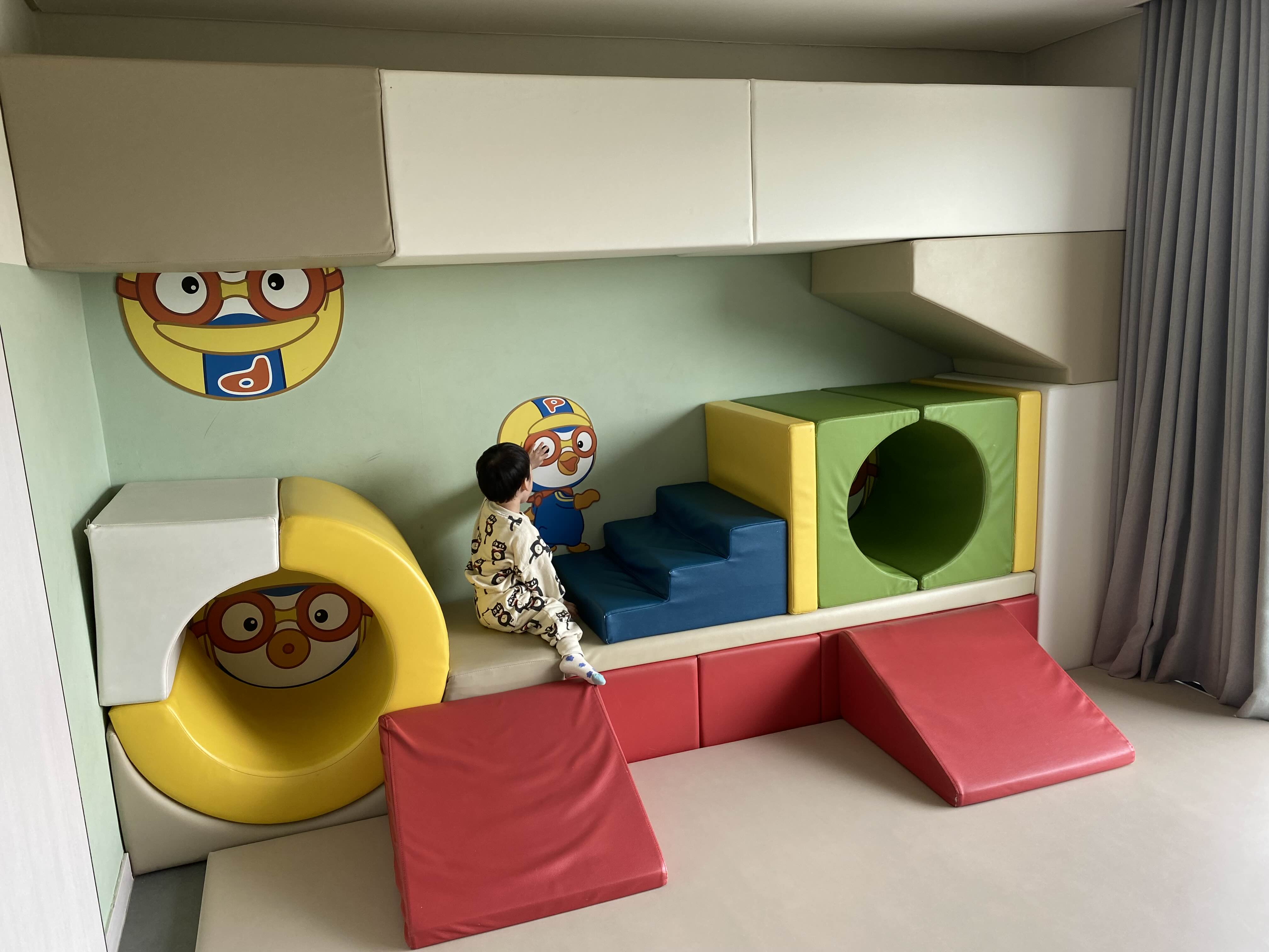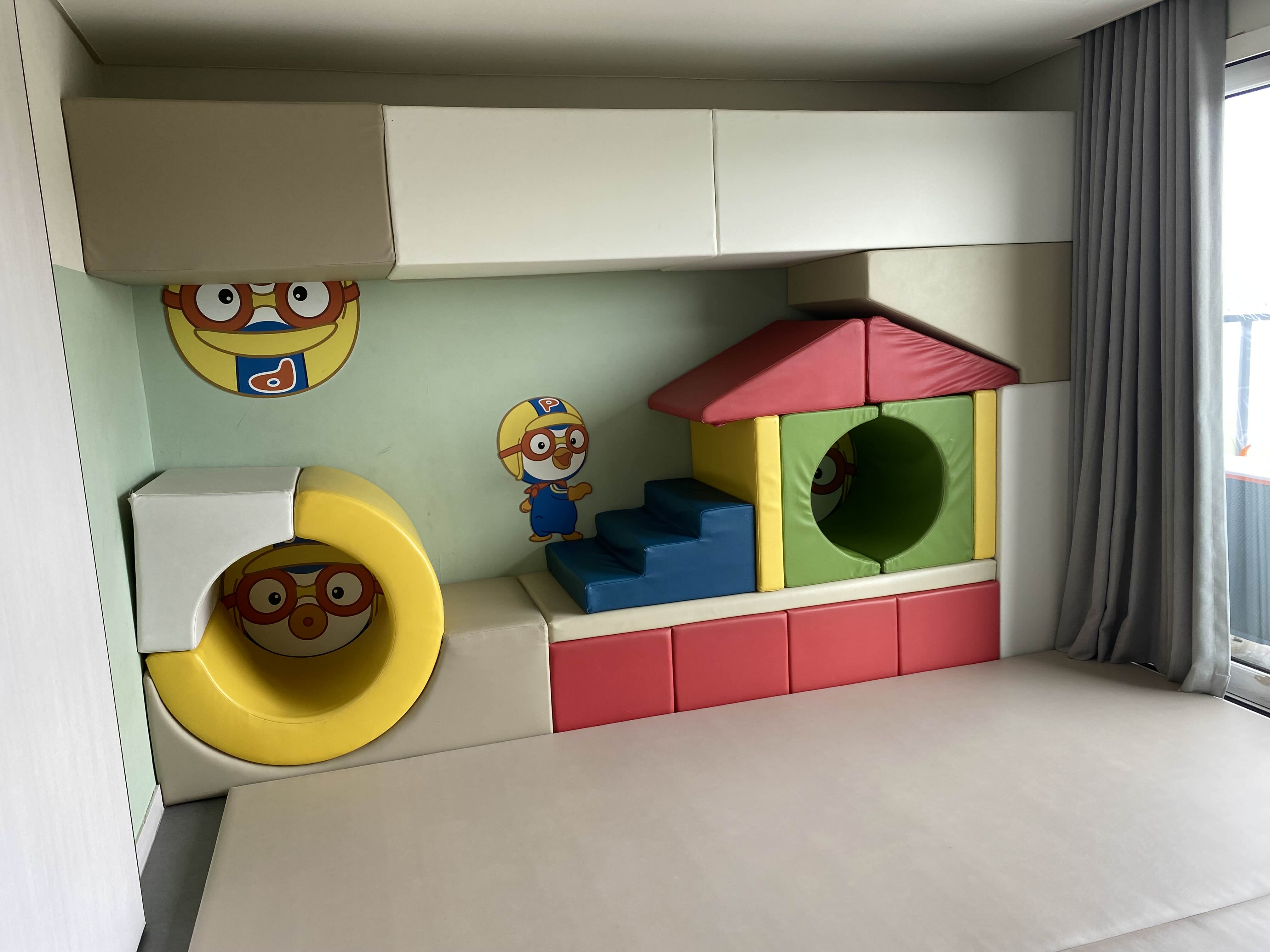 뽀로로 MAKE 객실의 특징이자 매력은 여러 모양의 블럭형 쿠션이 있어서, 각 블럭형 쿠션을 배치하는 형태와 구성에 따라 다양한 놀이장이 될 수 있어 아이도 질리지 않고 재밌게 놀 수 있었습니다. 거실 바닥에 매트가 깔려 있어 아이가 안전하게 뛰어놀 수 있어 좋네요.