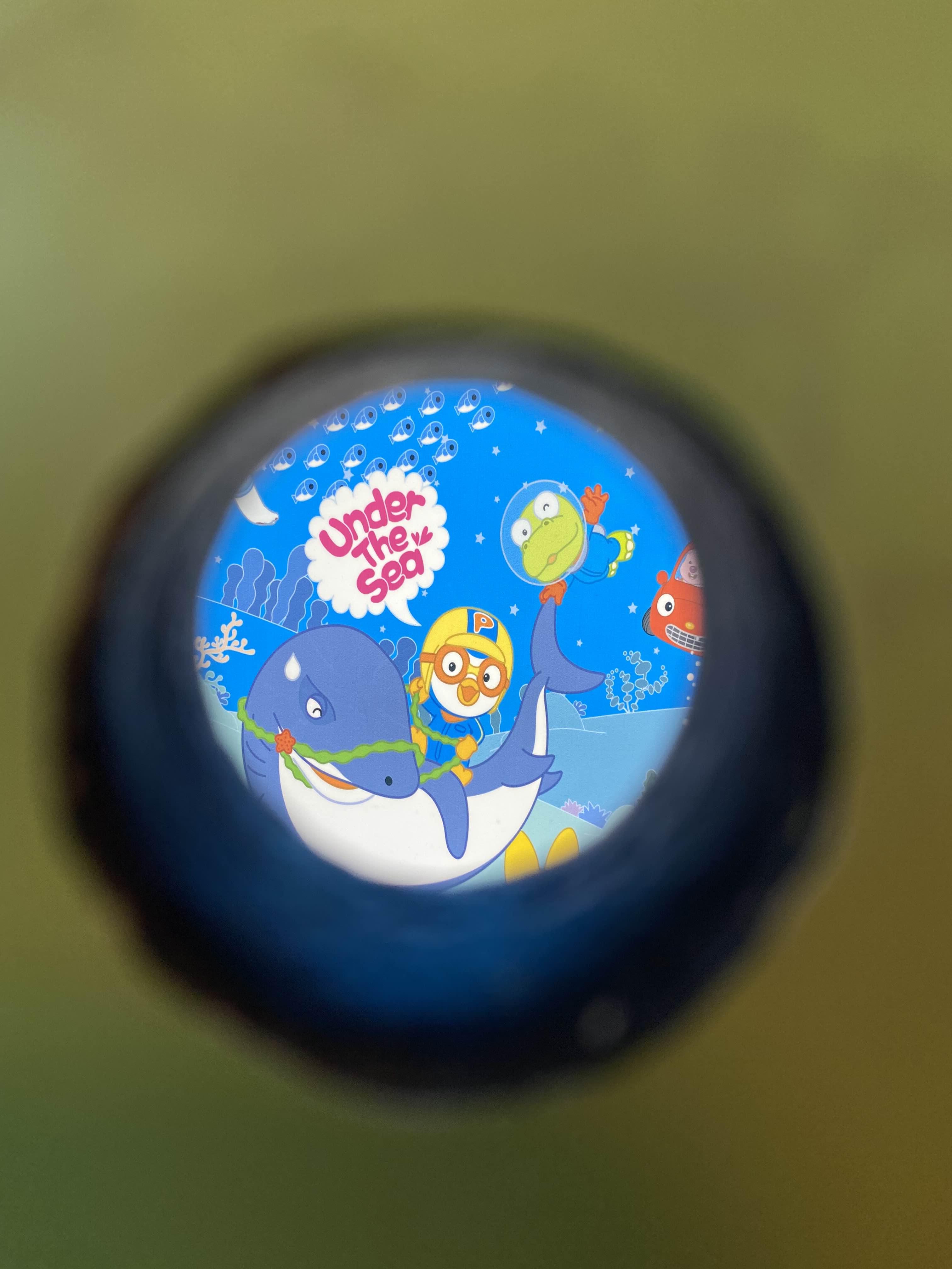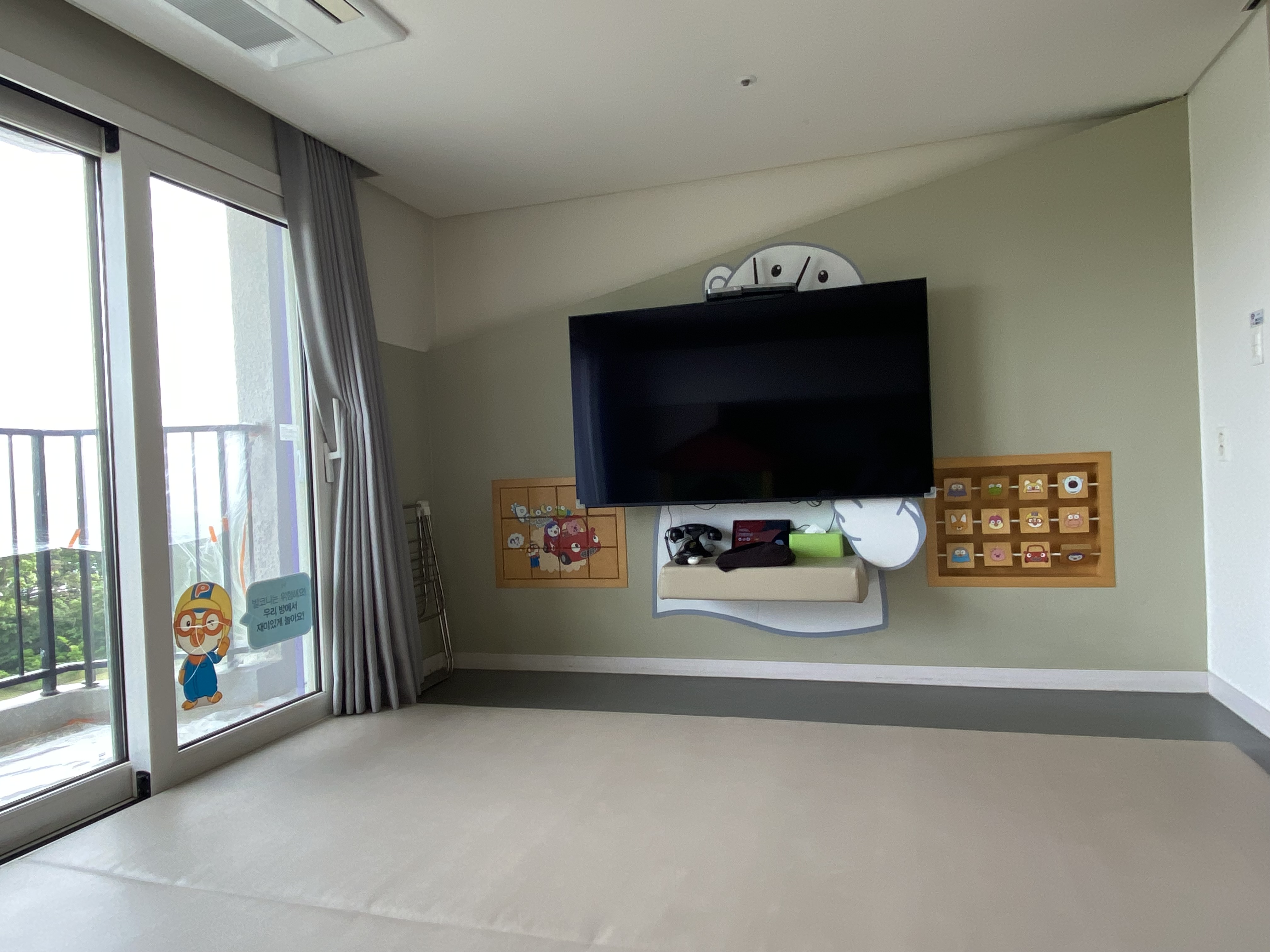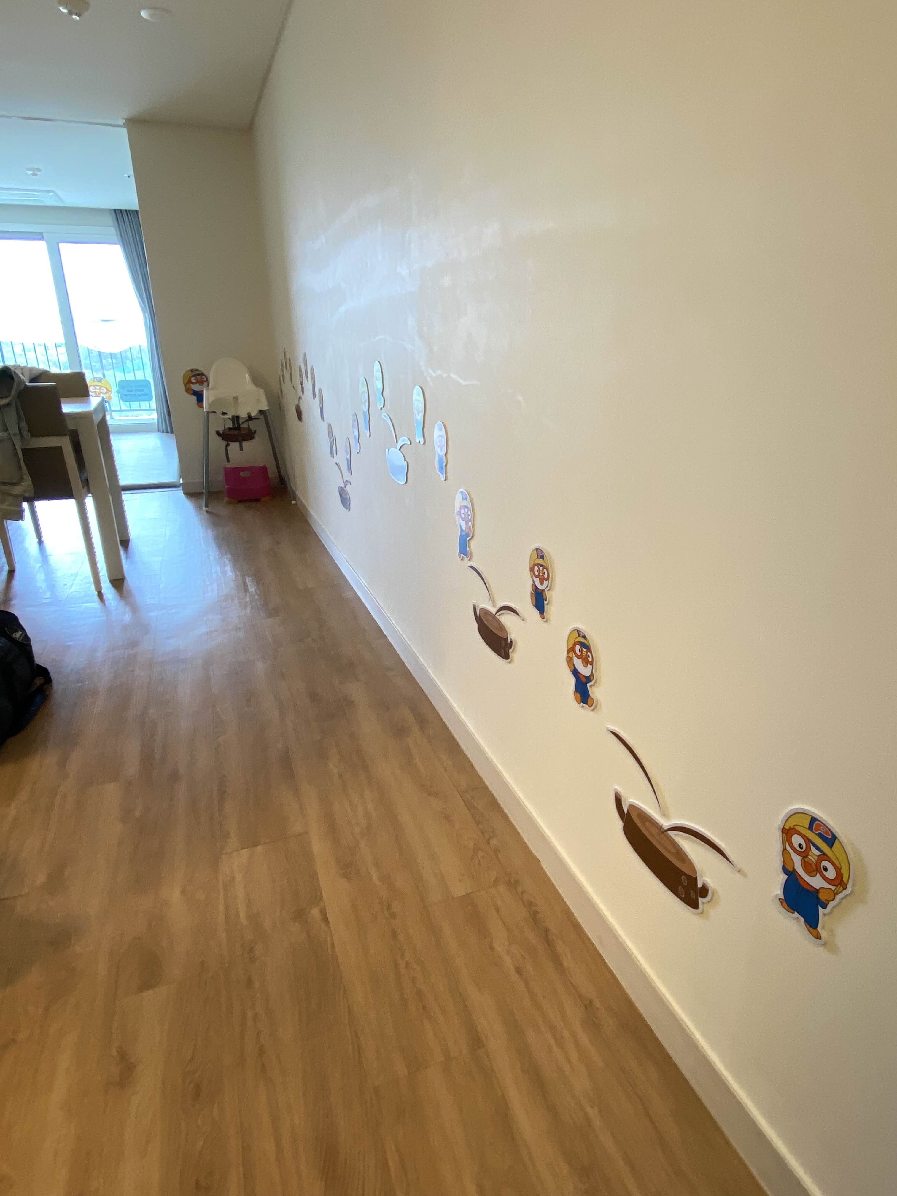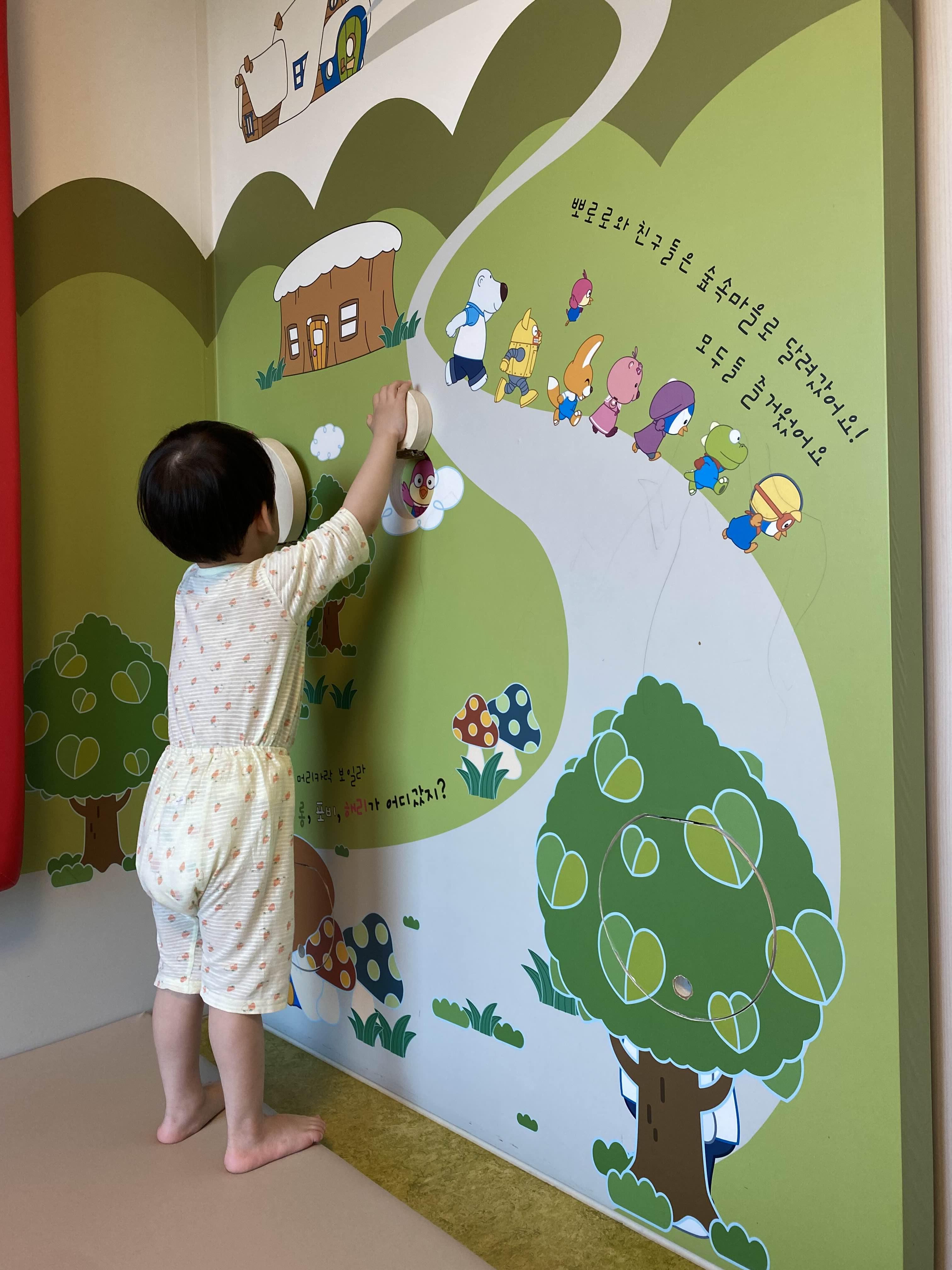 거실 벽면 한쪽에 동그란 구멍이 몇 개 있는데, 그 구멍사이로 뽀로로 캐릭터 그림을 볼 수 있어 아이로 하여금 호기심과 상상력을 자극할 수 있어 좋았습니다.^^