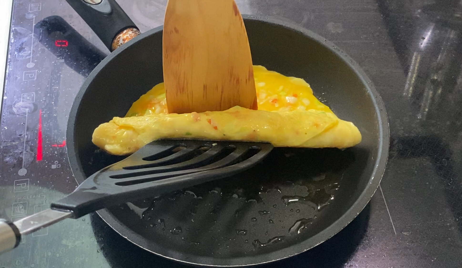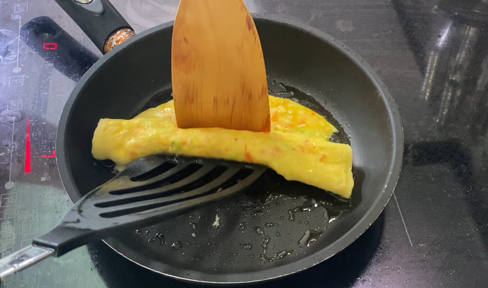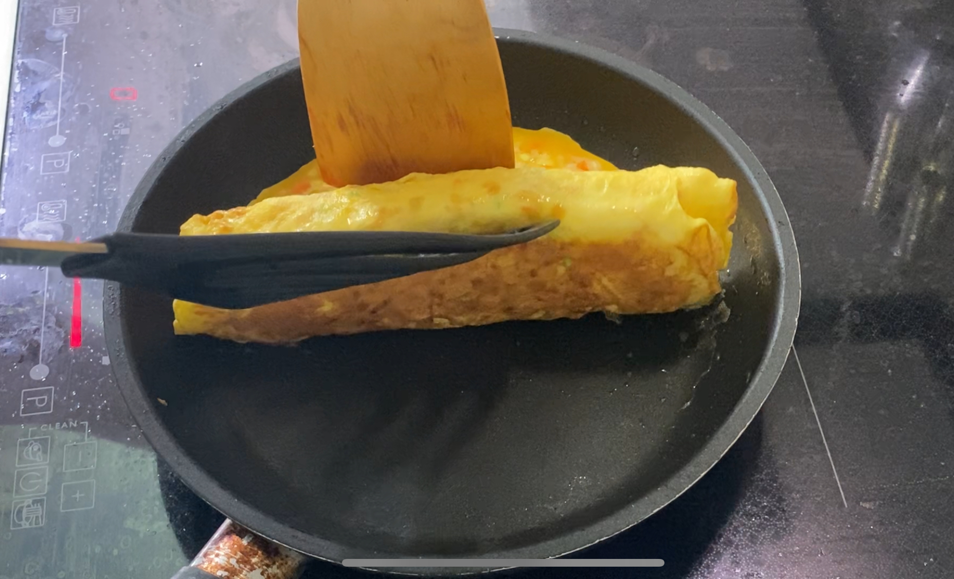얇게 펴진 계란말이 재료 아래쪽이 익어서 응고가 되면, 뒤집게 2개를 이용해서 한쪽 면부터 살살 말아줍니다.