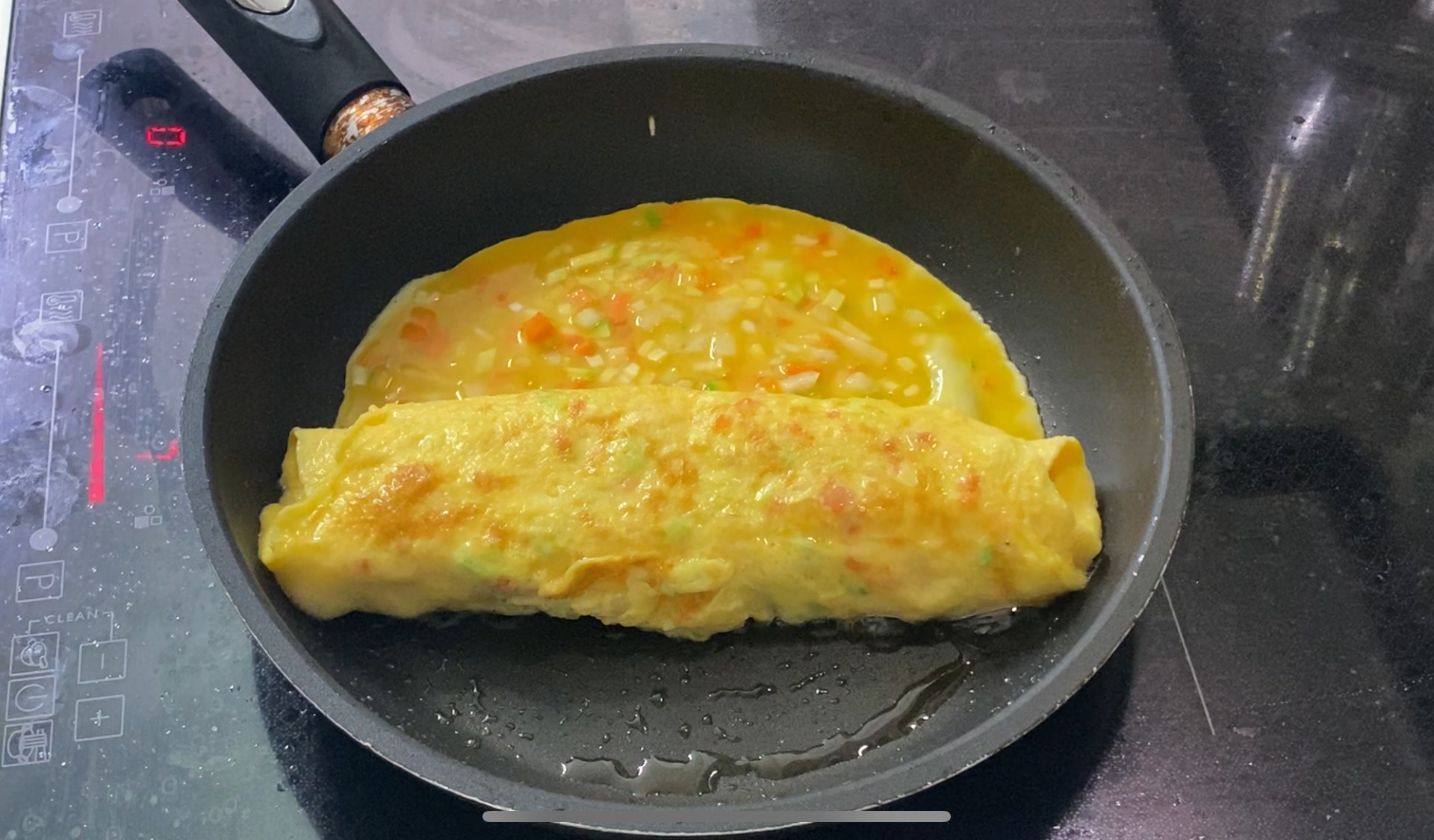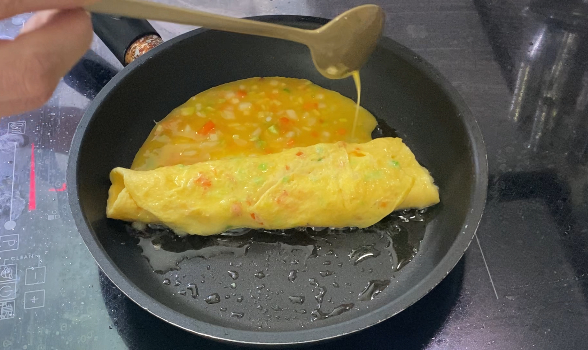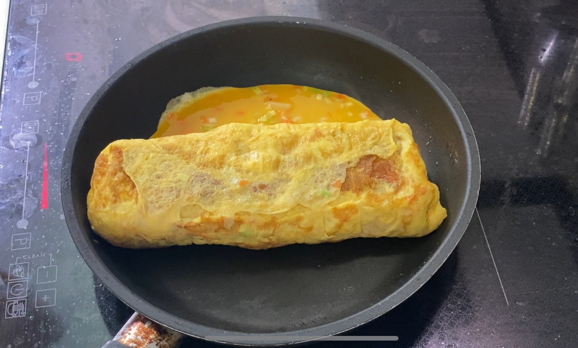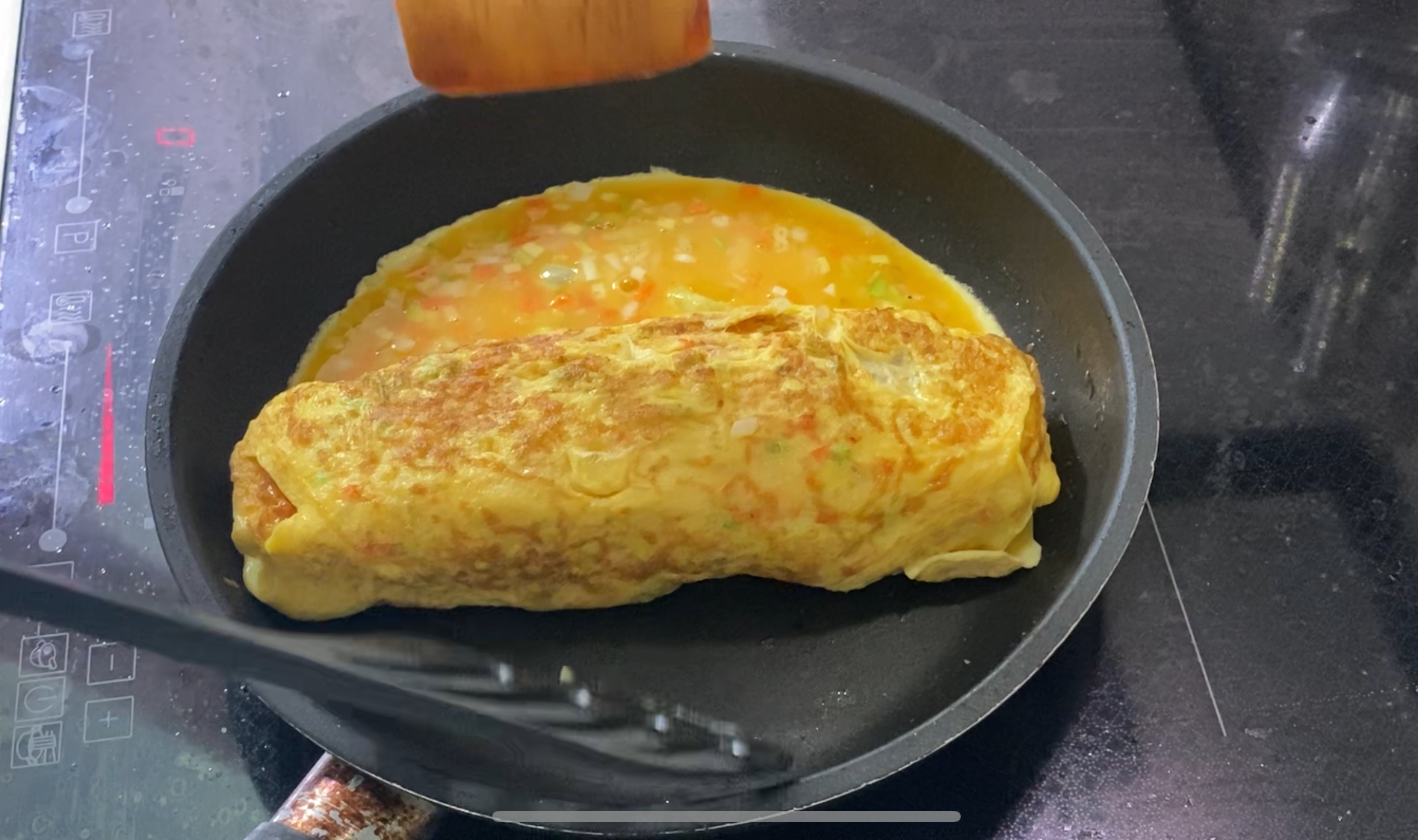 한번 다 말았으면, 계란말이 한 쪽면에 다시 속 재료를 붇고 같은 작업을 반복합니다.