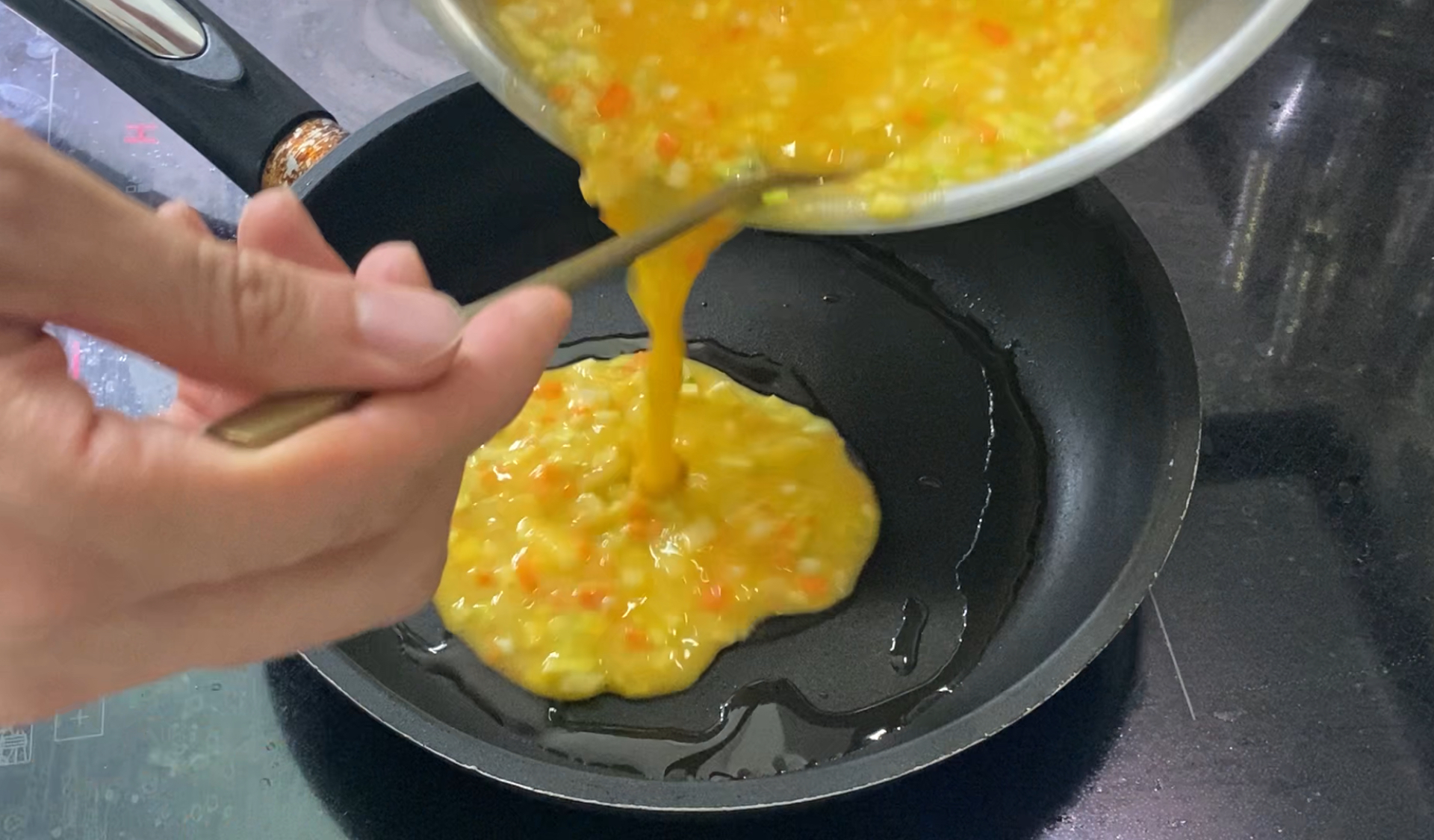 달궈진 프라이팬에 기름을 넉넉히 두릅니다. 시중에 계란말이용 네모난 프라이팬도 파는데, 저희 집에는 동그란 것밖에 없어서 프라이팬 중에 가장 작은 사이즈를 사용합니다.
