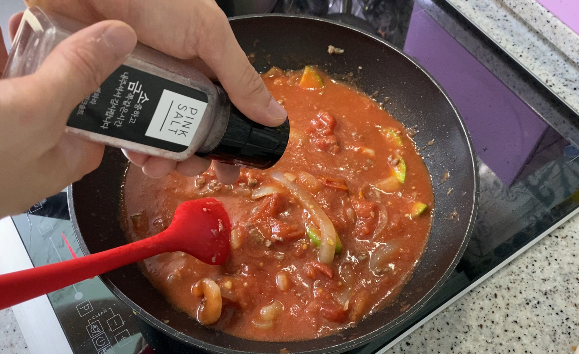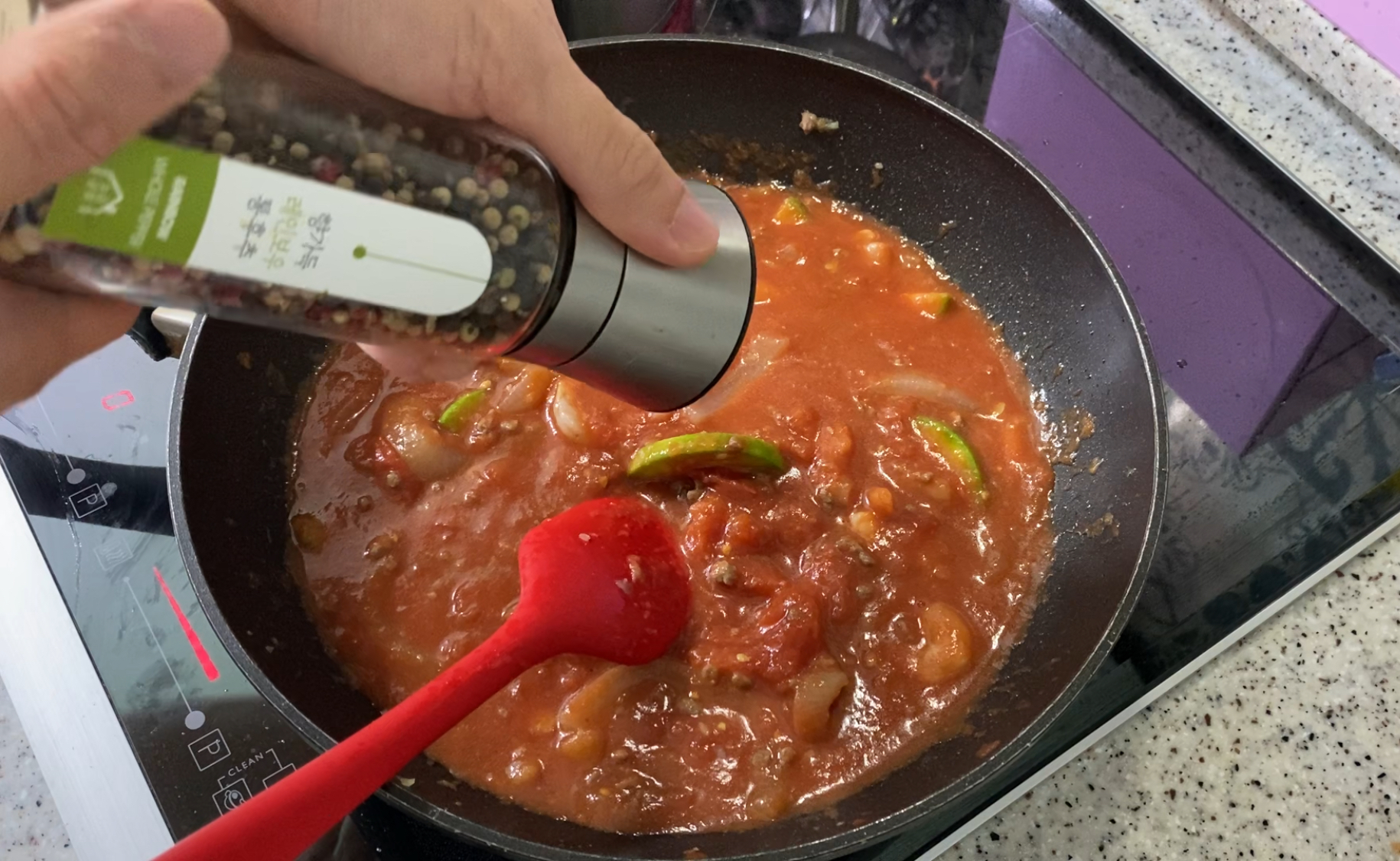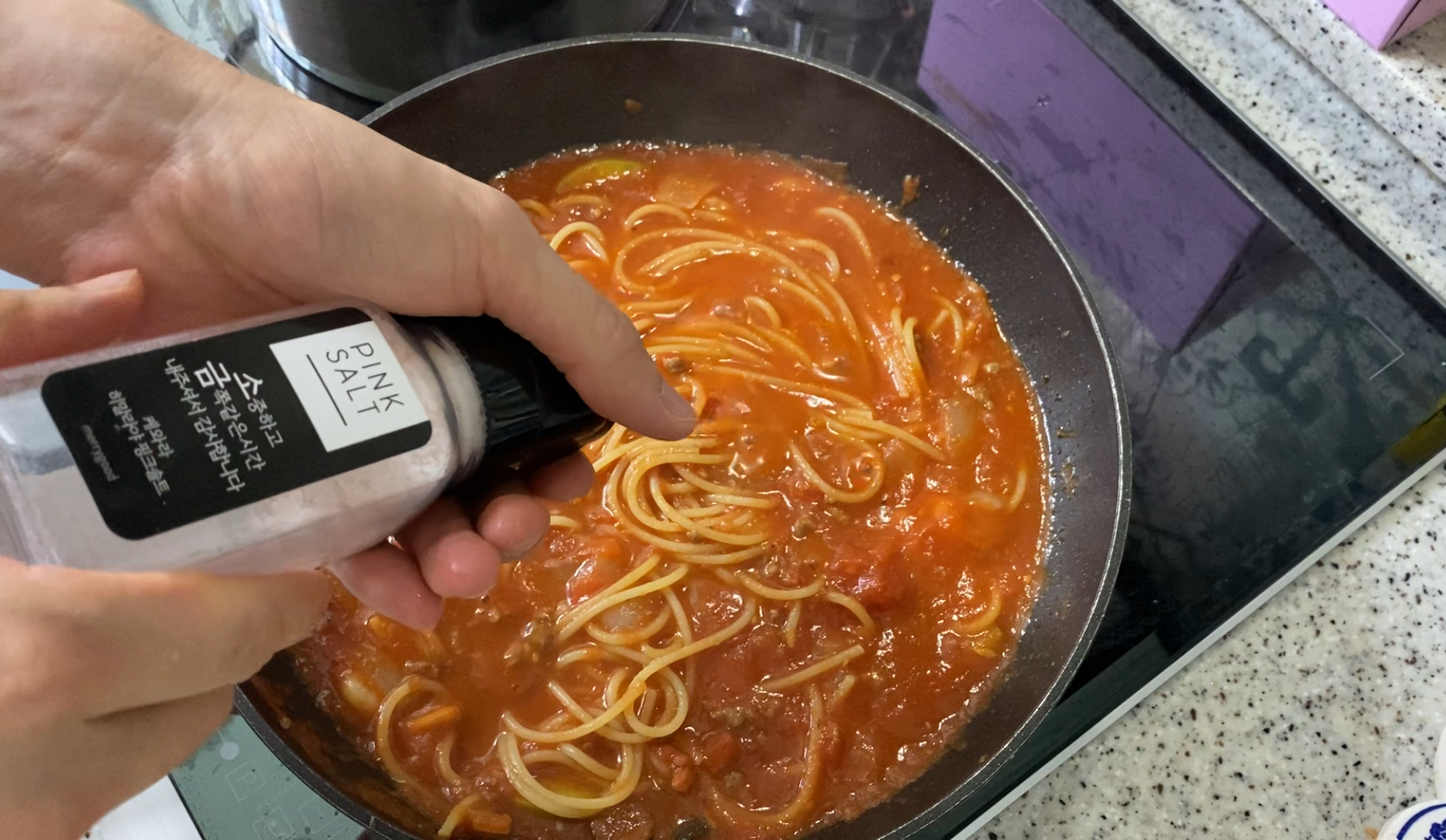 토마토 파스타를 만들 때 소금과 후추로 간을 맞추는데, 생각보다 제법 많은 양의 소금과 후추를 넣어야 합니다.