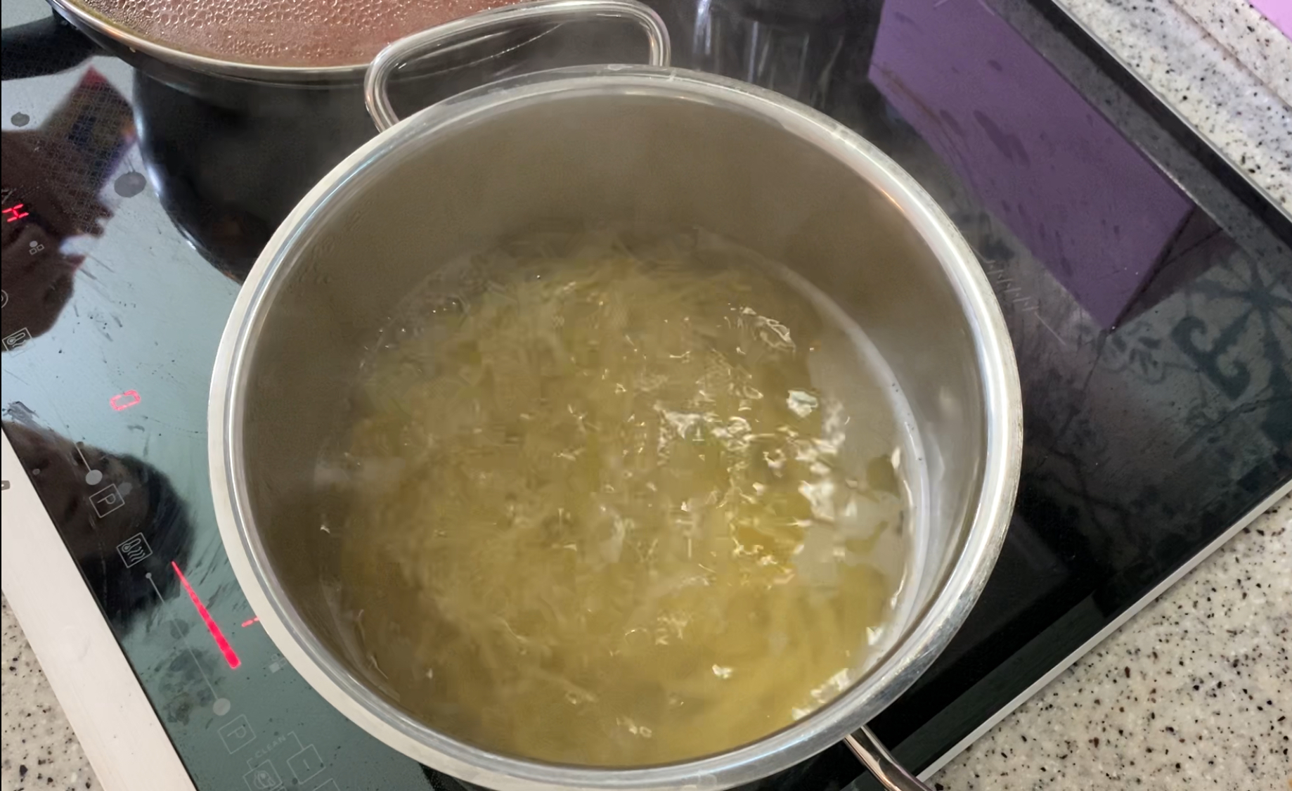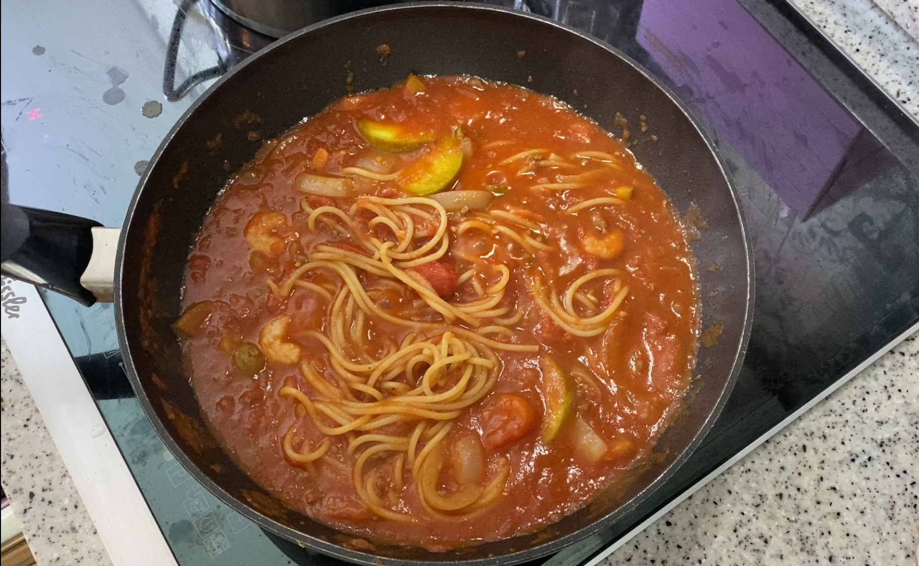 끓는 물에 7~8분 정도 삶아 알 덴테(al dente : 파스타에서 치아를 통해 건면의 씹는 맛이 느껴질 정도로 덜 익은 상태) 정도가 되면, 토마토 소스에 면을 옮겨 담아 마저 삶아줍니다.