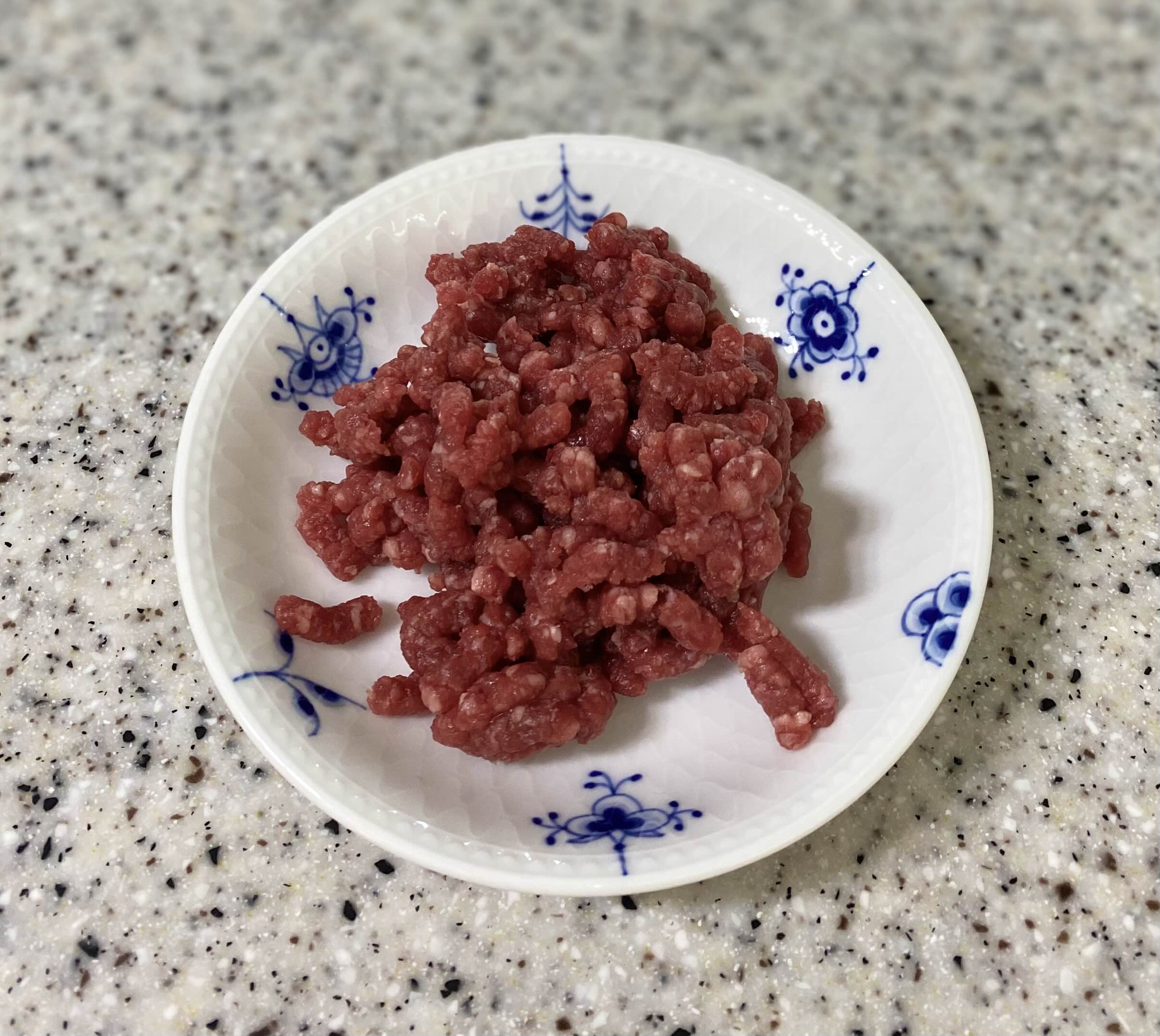 토마토 파스타 소스에 소고기 재료가 잘 섞일 수 있도록 다진 소고기를 준비하였습니다.