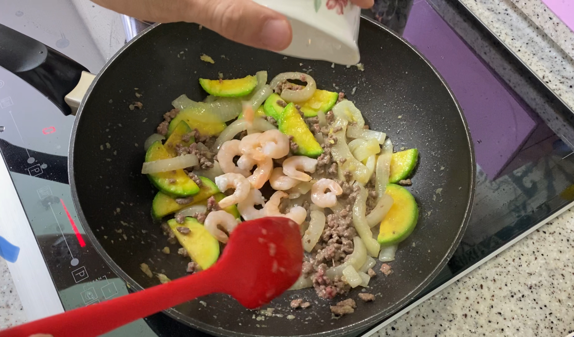 다진 소고기가 어느 정도 익어갈 즈음 새우살을 넣고 계속 볶아줍니다.