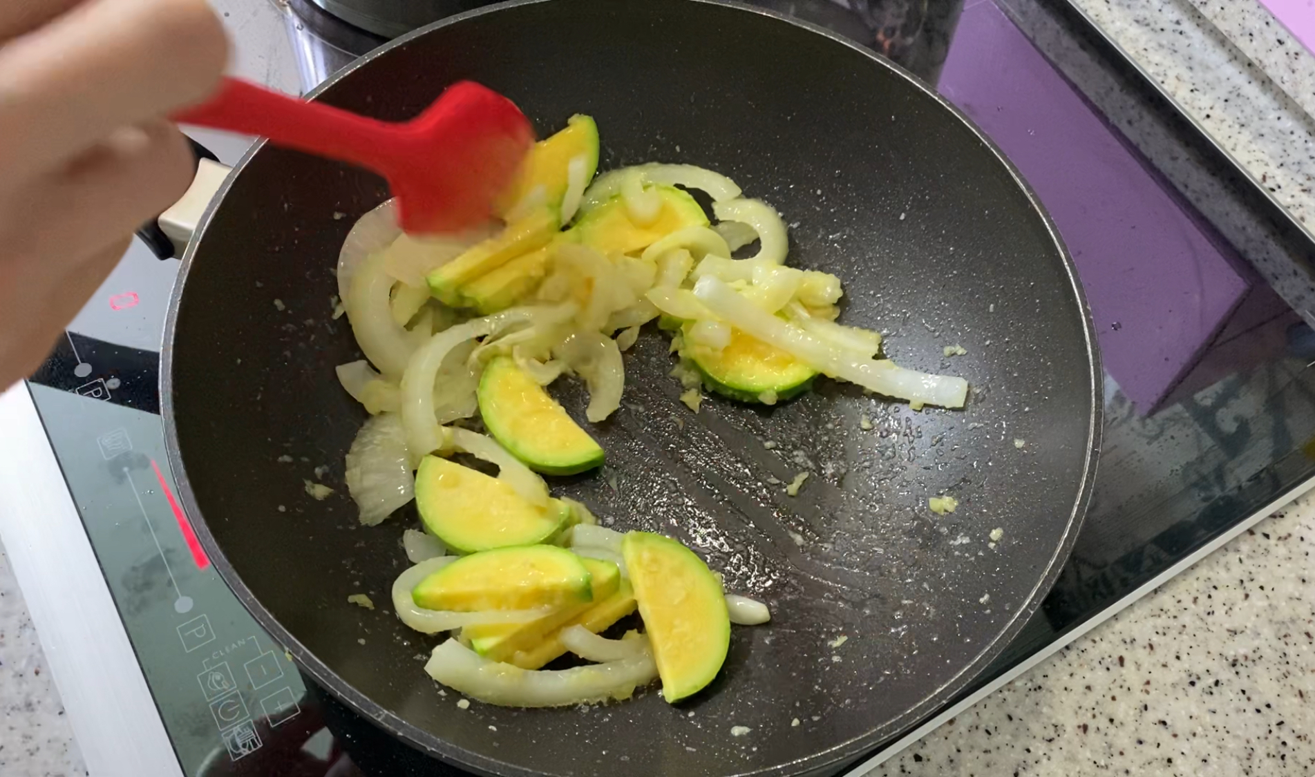 다음으로 애호박을 넣고 계속 저어가며 볶습니다.