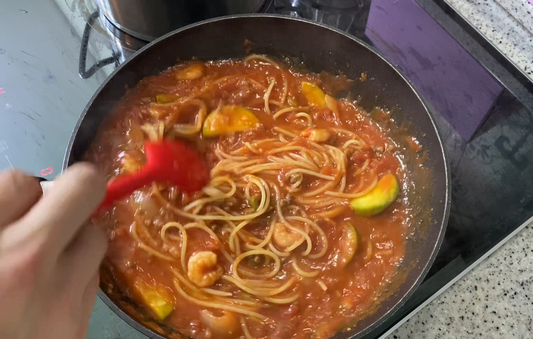 알 덴테 정도로 삶은 면을 토마토 소스가 있는 프라이팬에 옮겨 담아서 잘 저어주면서 마저 삶아줍니다.