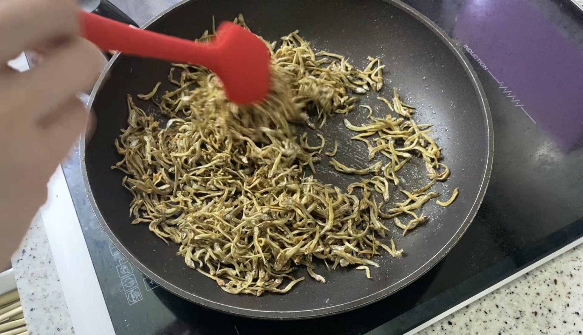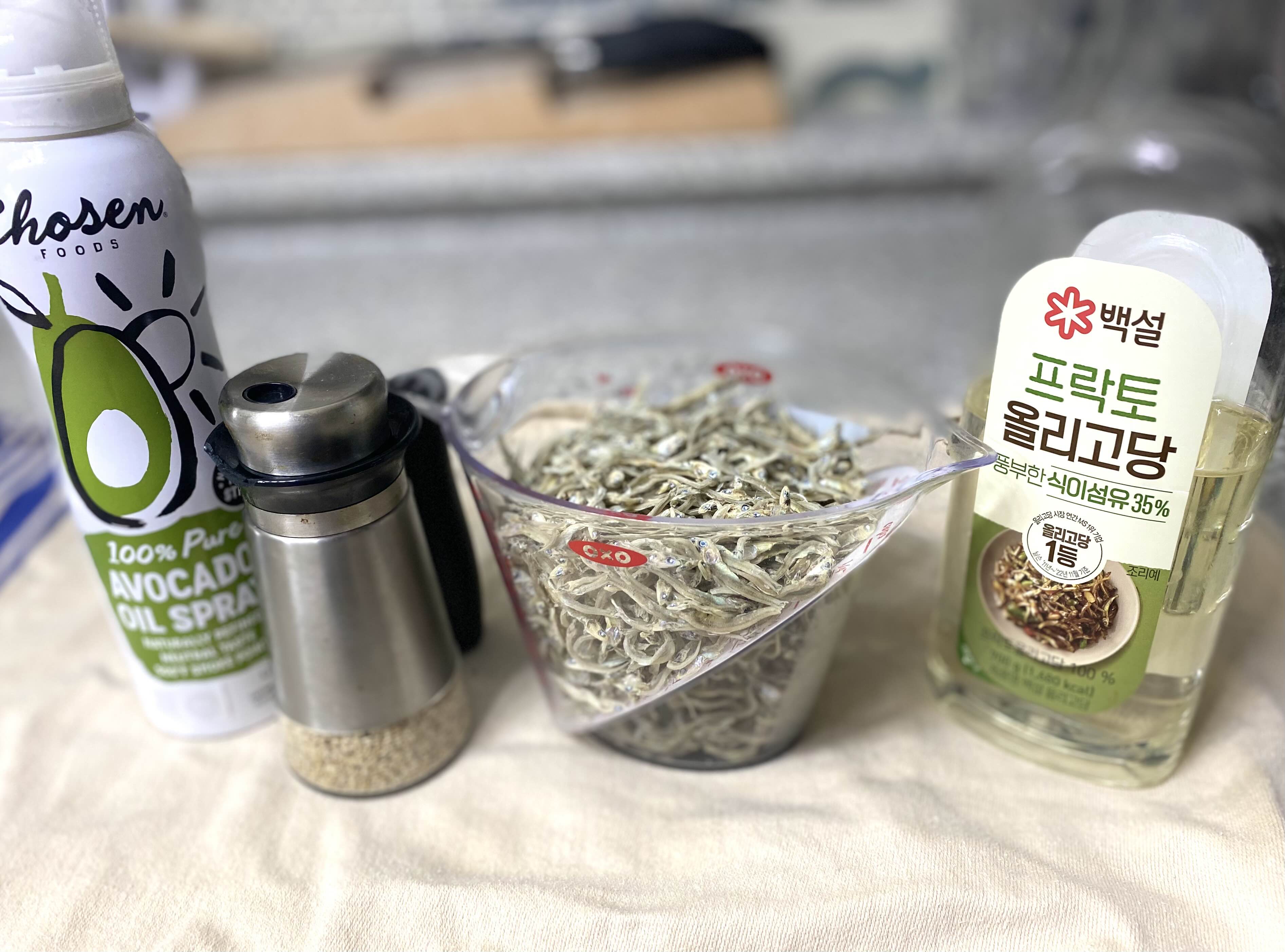 아보카드유를 두른 프라이팬에 멸치(500g)를 놓고 볶아줍니다. 이때 불의 세기는 중불과 강불 사이 정도로 맞춰 놓고 멸치가 타지 않도록 실리콘 주걱으로 계속 저어 줍니다. 달궈진 프라이팬에 멸치를 볶는 이유는 멸치에 있는 수분을 제거하기 위함입니다.
