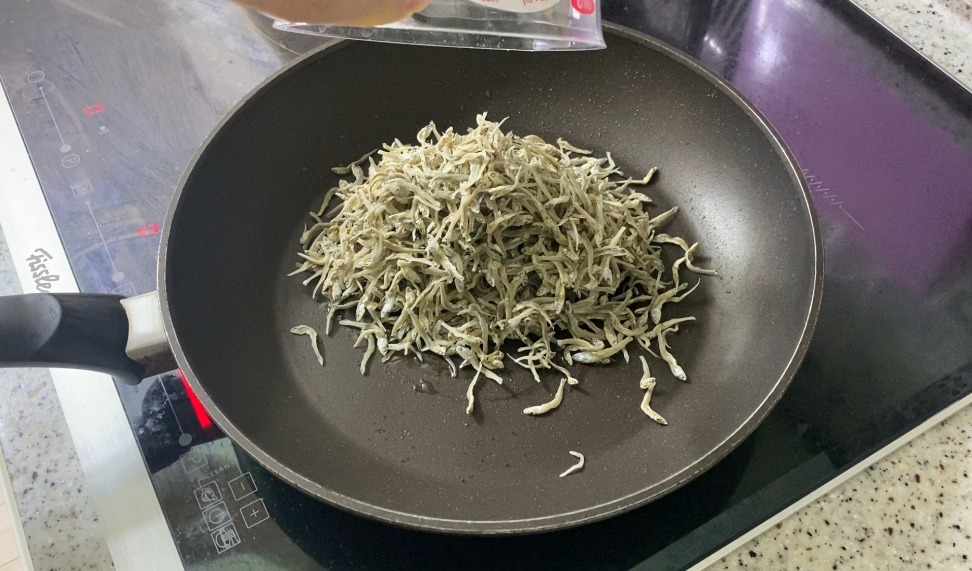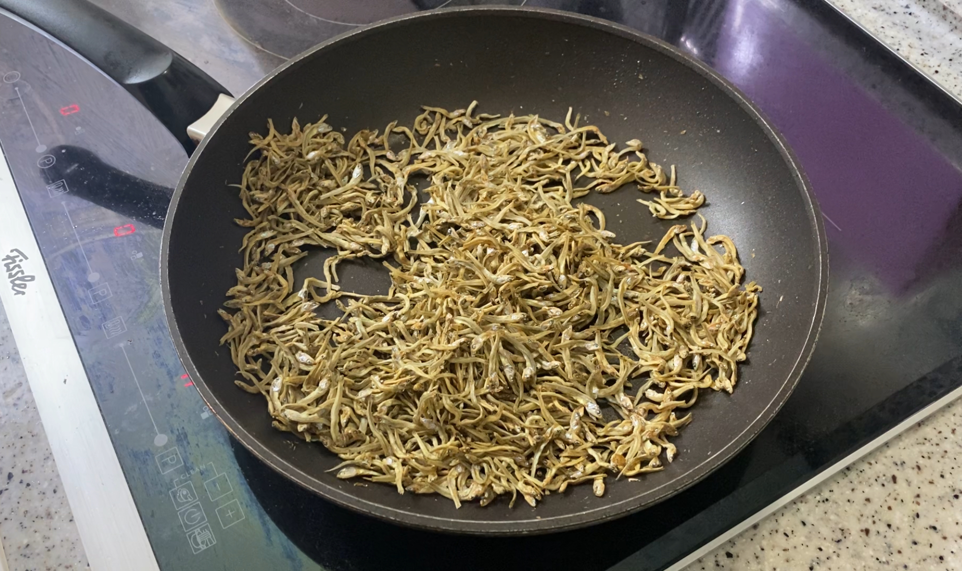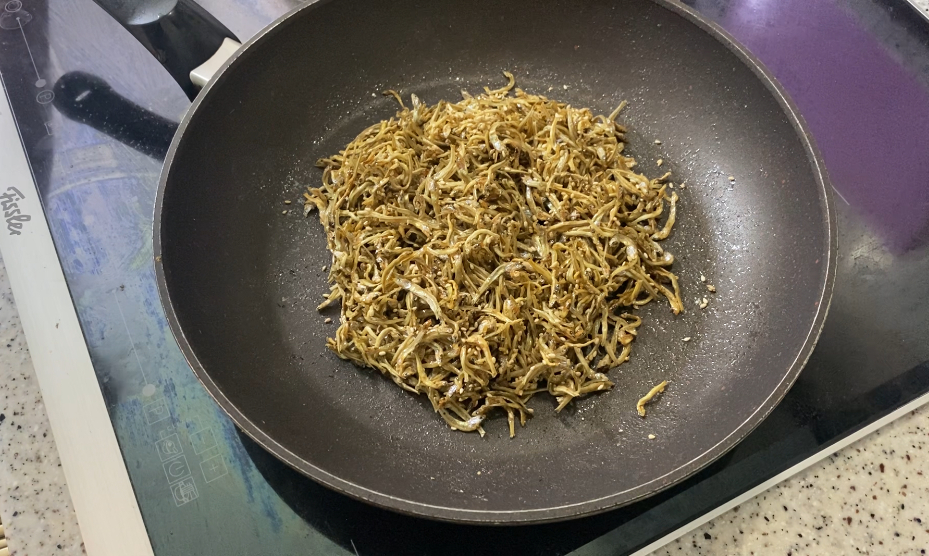 이때 중요한 것은 멸치에 머금은 수분이 충분히 제거되어 바삭해지는 느낌을 들 정도로 충분히 볶아주어야 합니다. 대략 7~9분 정도 계속 볶아 주어야 합니다.