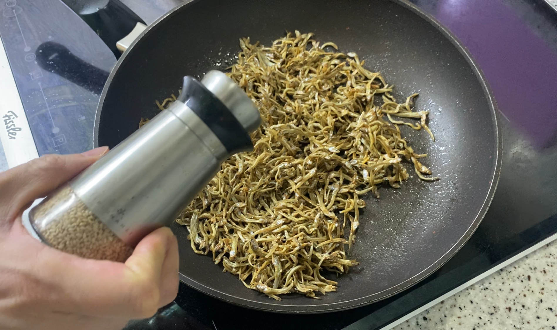 올리고당과 잘 섞어진 멸치볶음에 고소한 맛을 내기 위해 마지막으로 참깨를 충분히 뿌려줍니다.