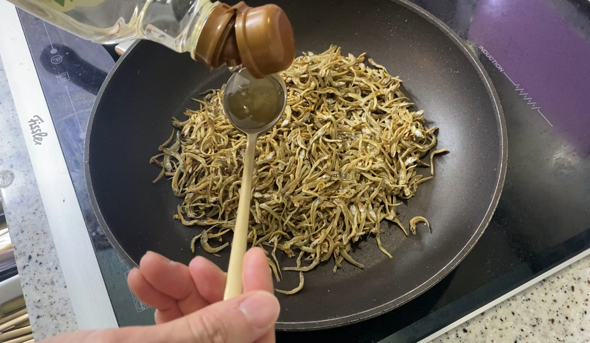 4. 잘 볶아진 멸치에 올리고당을 섞어주기