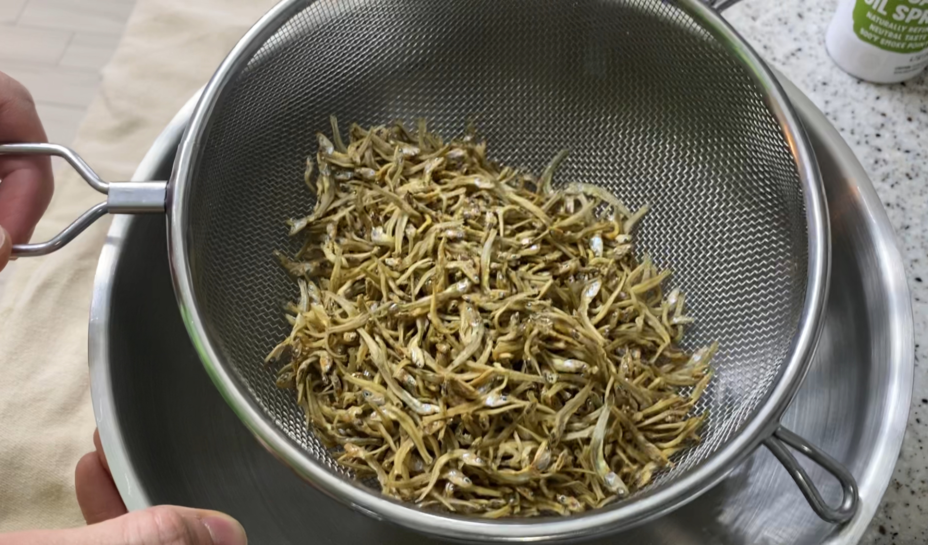 프라이팬에서 충분히 바삭하게 볶아진 멸치를 채로 옮겨 담아 털어서 잡티를 제거해 줍니다.