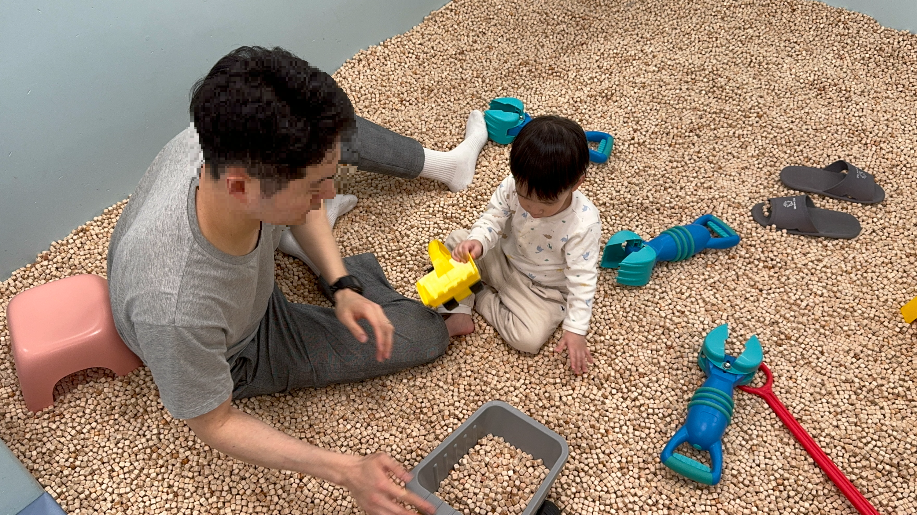 주변 새로운 환경에 호기심이 많아 이리 저리 끊임없이 움직이는 아이를 따라 다니며 저도 아이와 함께 이런 저런 기구와 장난감으로 다양한 놀이를 하였습니다.